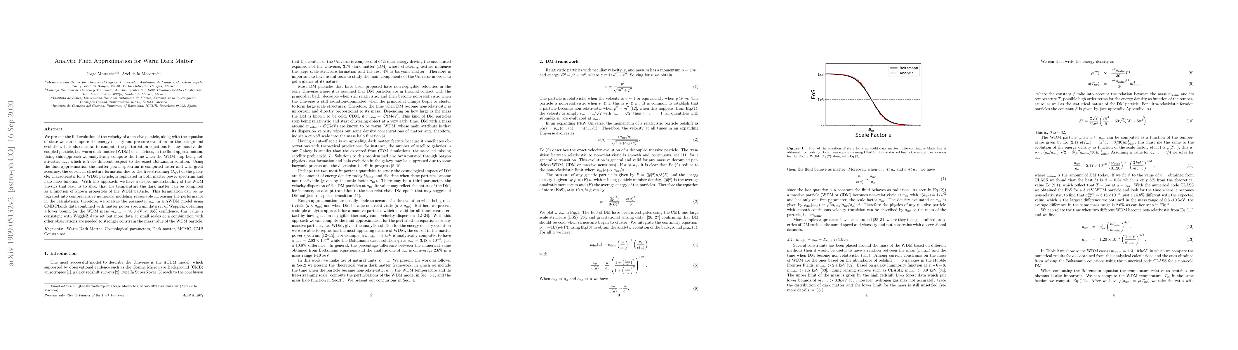 We present the full evolution of the velocity of a massive particle, along with the equation of state we can compute the energy density and pressure evolution for the background evolution. It is also natural to compute the perturbation equations for any massive decoupled particle, i.e. warm dark matter (WDM) or neutrinos, in the fluid approximation. Using this approach we analytically compute the time when the WDM stop being relativistic, $a_{nr}$, which is 2.6\% different respect to the exact Boltzmann solution. Using the fluid approximation the matter power spectrum is computed faster and with great accuracy, the cut-off in structure formation due to the free-streaming ($\lambda_{fs}$) of the particle, characteristic for a WDM particle, is replicated in both matter power spectrum and halo mass function. With this approach, we have a deeper understanding of the WDM physics that lead us to show that the temperature the dark matter can be computed as a function of known properties of the WDM particle. This formulation can be integrated into comprehensive numerical modeling reasonable increasing the performance in the calculations, therefore, we analyze the parameter $a_{nr}$ in a $\Lambda$WDM model using CMB Planck data combined with matter power spectrum data set of WiggleZ, obtaining a lower bound for the WDM mass $m_{\rm wdm} = 70.3$ eV at 86\% confidence, this value is consistent with WiggleZ data set but more data at small scales or a combination with other observations are needed to stronger constrain the mass value of the WDM particle.