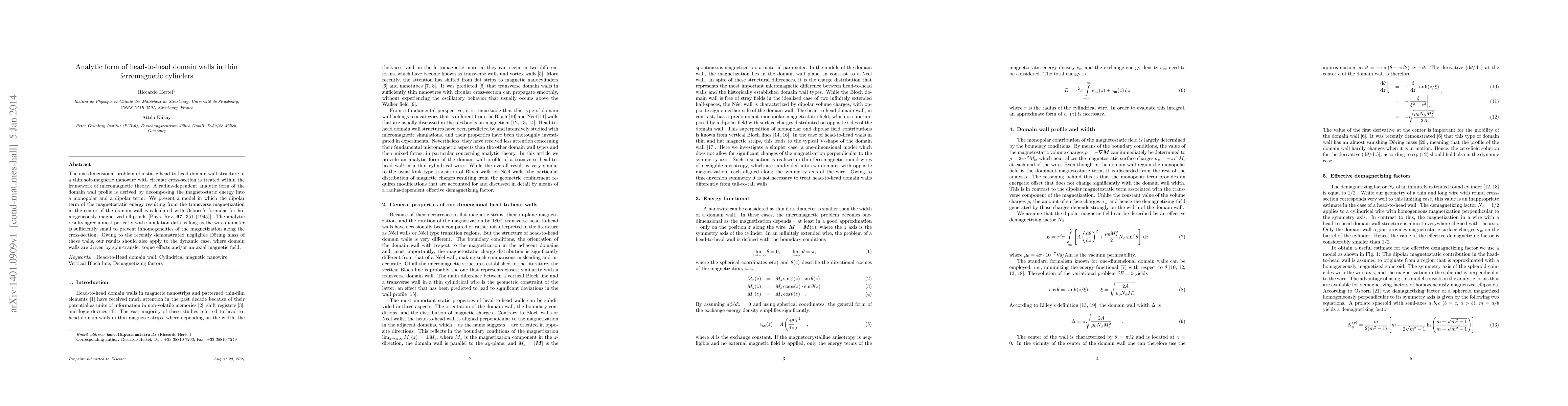 Researchers derived an analytic form of head-to-head domain walls in thin ferromagnetic cylinders, showing agreement with simulation data for small wire diameters, which should also apply to dynamic cases due to negligible D"oring mass.