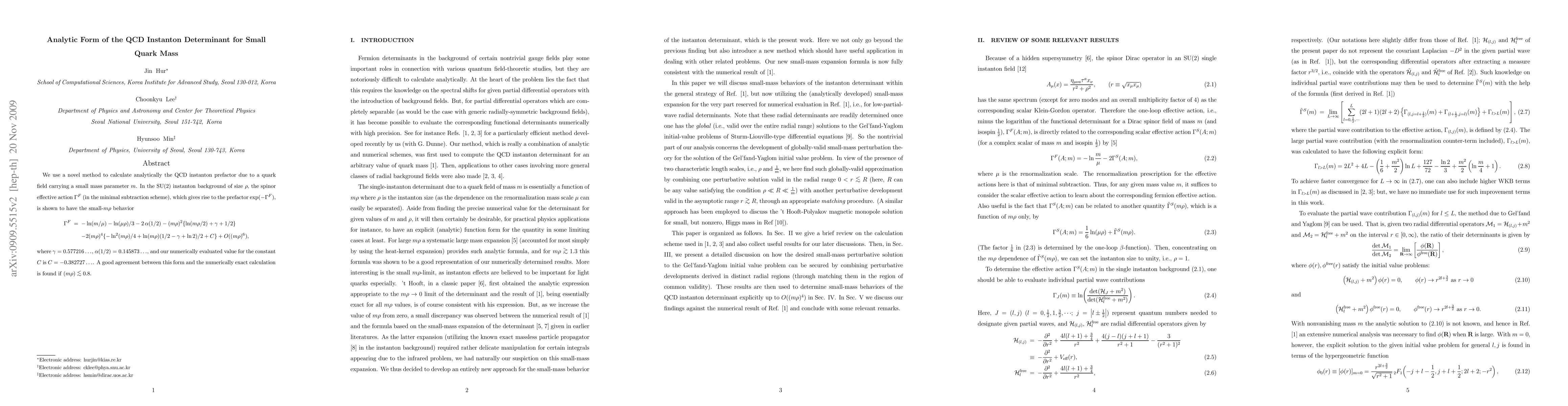 We use a novel method to calculate analytically the QCD instanton prefactor due to a quark field carrying a small mass parameter $m$. In the SU(2) instanton background of size $\rho$, the spinor effective action $\Gamma^F$ (in the minimal subtraction scheme), which gives rise to the prefactor $\exp (-\Gamma^F)$, is shown to have the small-$m \rho$ behavior \Gamma^F = -\ln (m /\mu) - \ln (\mu\rho)/3 -2 \alpha(1/2) -(m \rho)^2 \{\ln (m \rho /2) +\gamma+1/2\} -2 (m \rho)^4 \{-\ln ^2(m \rho)/4+\ln (m \rho) (1/2-\gamma +\ln 2)/2+C \} +O((m \rho)^6), where $\gamma=0.577216...$, $\alpha(1/2)=0.145873...$, and our numerically evaluated value for the constant $C$ is $C=-0.382727...$. A good agreement between this form and the numerically exact calculation is found if $(m \rho) \lesssim 0.8$.