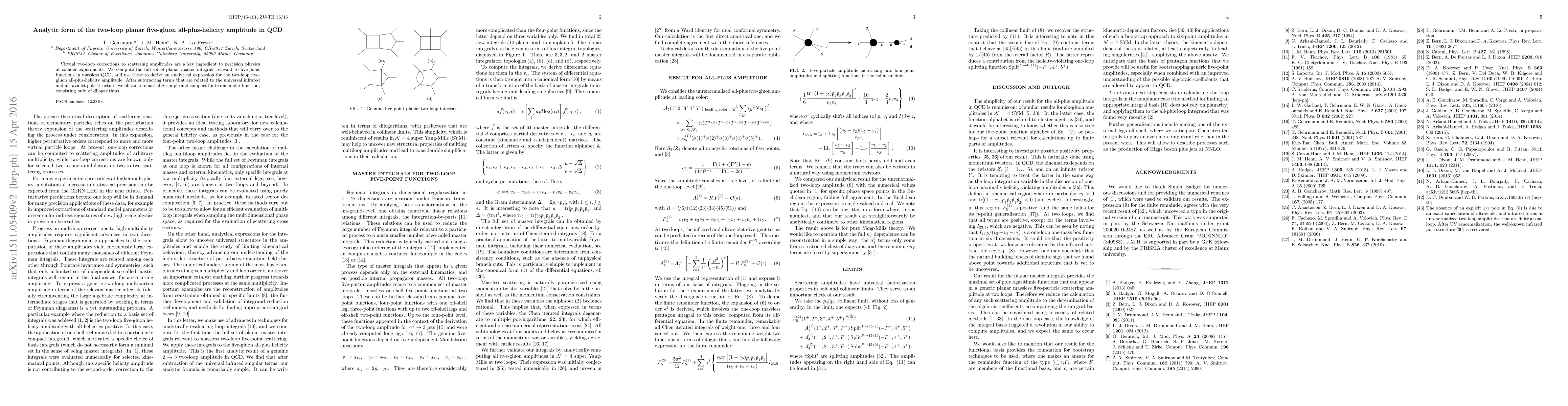 This paper computes the analytic form of the two-loop planar five-gluon all-plus-helicity amplitude in QCD, deriving an expression from planar master integrals and simplifying it to a finite remainder function composed solely of dilogarithms. This work contributes to the precision of collider experiments by addressing virtual two-loop corrections in scattering amplitudes.