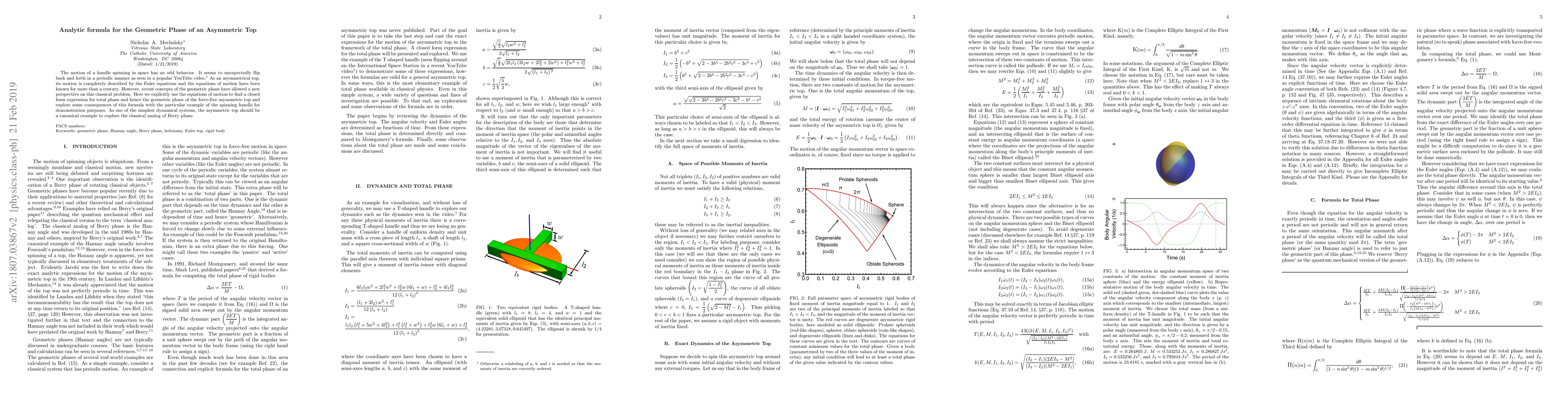 The motion of a handle spinning in space has an odd behavior. It seems to unexpectedly flip back and forth in a periodic manner as seen in a popular YouTube video. As an asymmetrical top, its motion is completely described by the Euler equations and the equations of motion have been known for more than a century. However, recent concepts of the geometric phase have allowed a new perspective on this classical problem. Here we explicitly use the equations of motion to find a closed form expression for total phase and hence the geometric phase of the force-free asymmetric top and explore some consequences of this formula with the particular example of the spinning handle for demonstration purposes. As one of the simplest dynamical systems, the asymmetric top should be a canonical example to explore the classical analog of Berry phase.