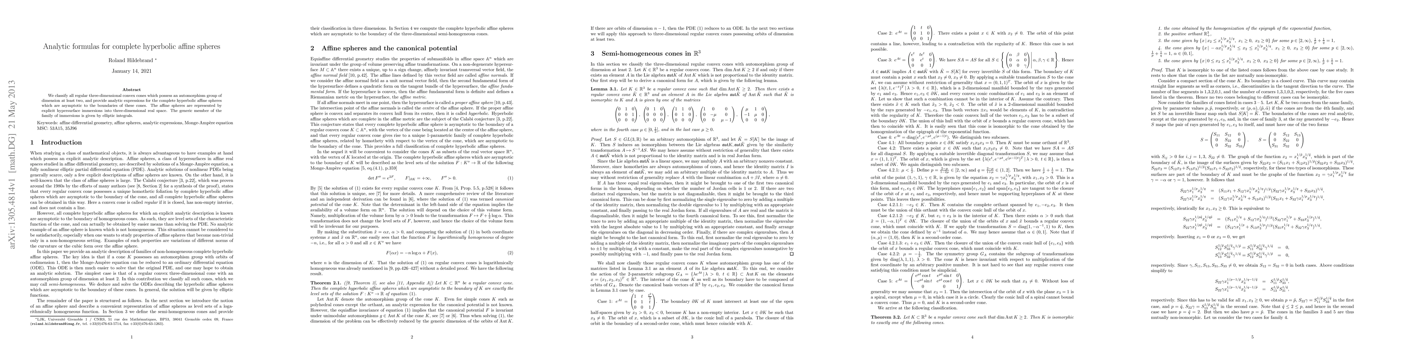 We classify all regular three-dimensional convex cones which possess an automorphism group of dimension at least two, and provide analytic expressions for the complete hyperbolic affine spheres which are asymptotic to the boundaries of these cones. The affine spheres are represented by explicit hypersurface immersions into three-dimensional real space. The generic member of the family of immersions is given by elliptic integrals.