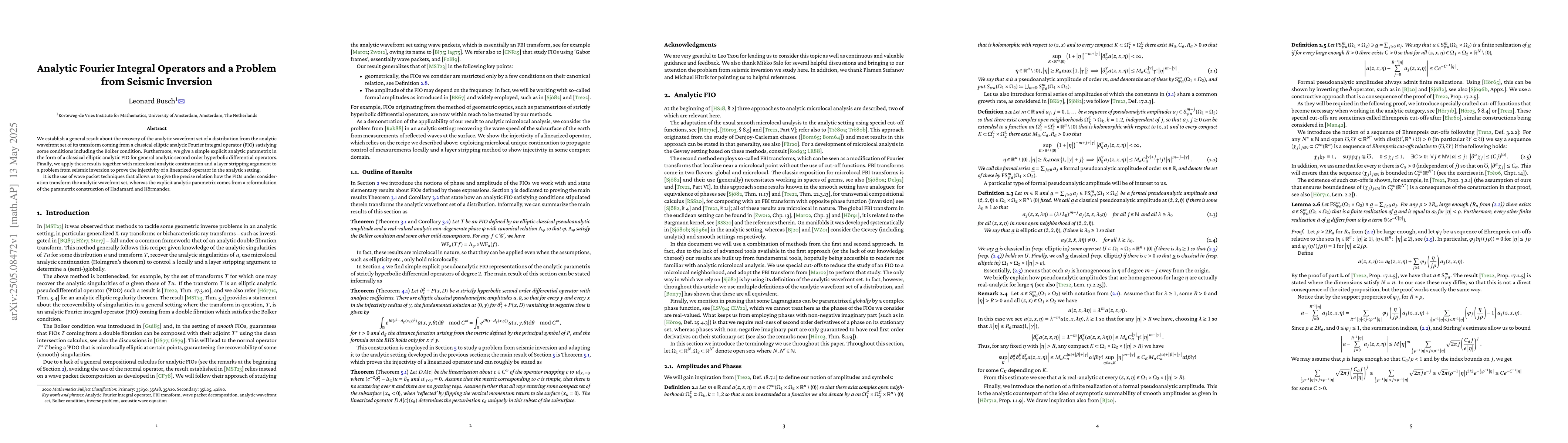 The paper presents a general result on the recovery of analytic wavefront sets using analytic FIOs, along with an explicit parametrix for second-order hyperbolic differential operators, and applies these to a seismic inversion problem.