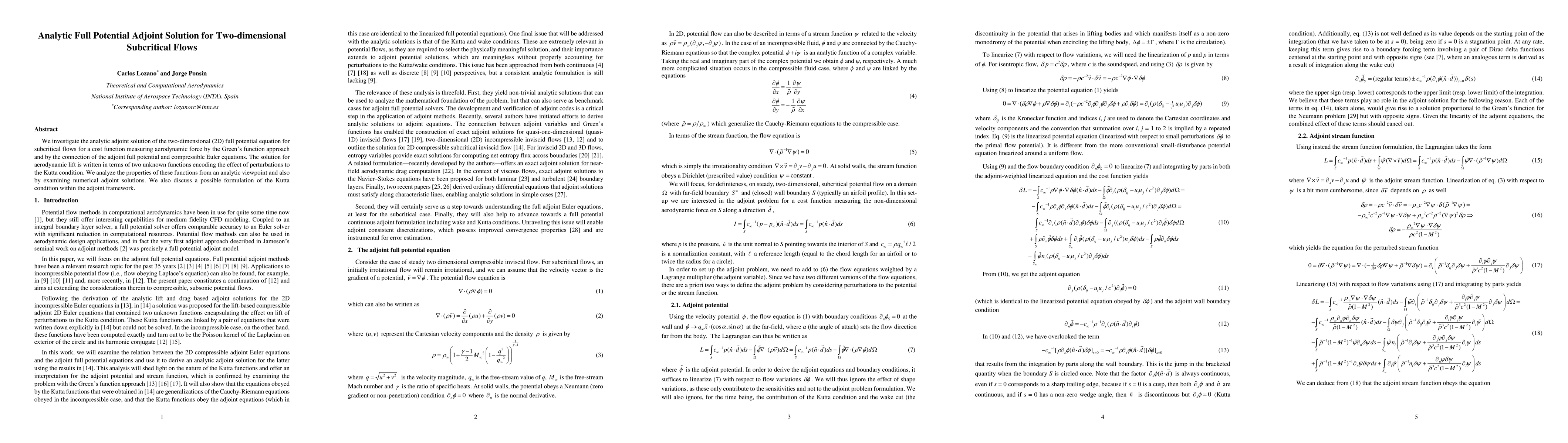 We investigate the analytic adjoint solution of the two-dimensional (2D) full potential equation for subcritical flows for a cost function measuring aerodynamic force by the Green's function approach and by the connection of the adjoint full potential and compressible Euler equations. The solution for aerodynamic lift is written in terms of two unknown functions encoding the effect of perturbations to the Kutta condition. We analyze the properties of these functions from an analytic viewpoint and also by examining numerical adjoint solutions. We also discuss a possible formulation of the Kutta condition within the adjoint framework