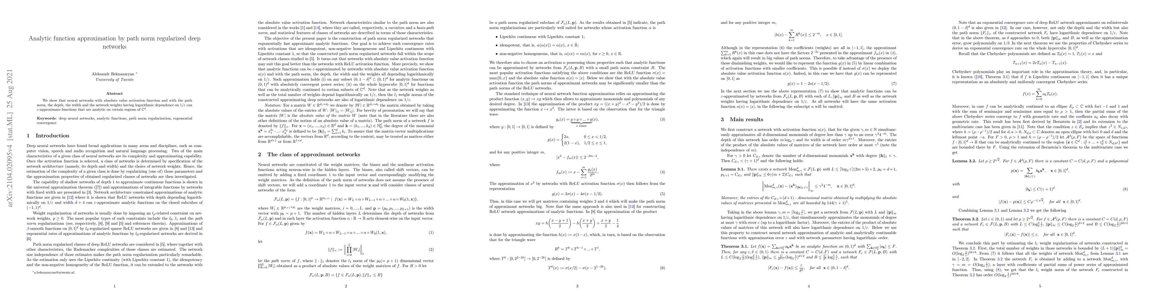 Summary: This paper demonstrates that deep neural networks with absolute value activation and path norm regularization can approximate analytic functions to an $\varepsilon$ level of accuracy, with network parameters dependent logarithmically on $1/\varepsilon$. This approach highlights the effectiveness of such networks in handling complex analytic functions.