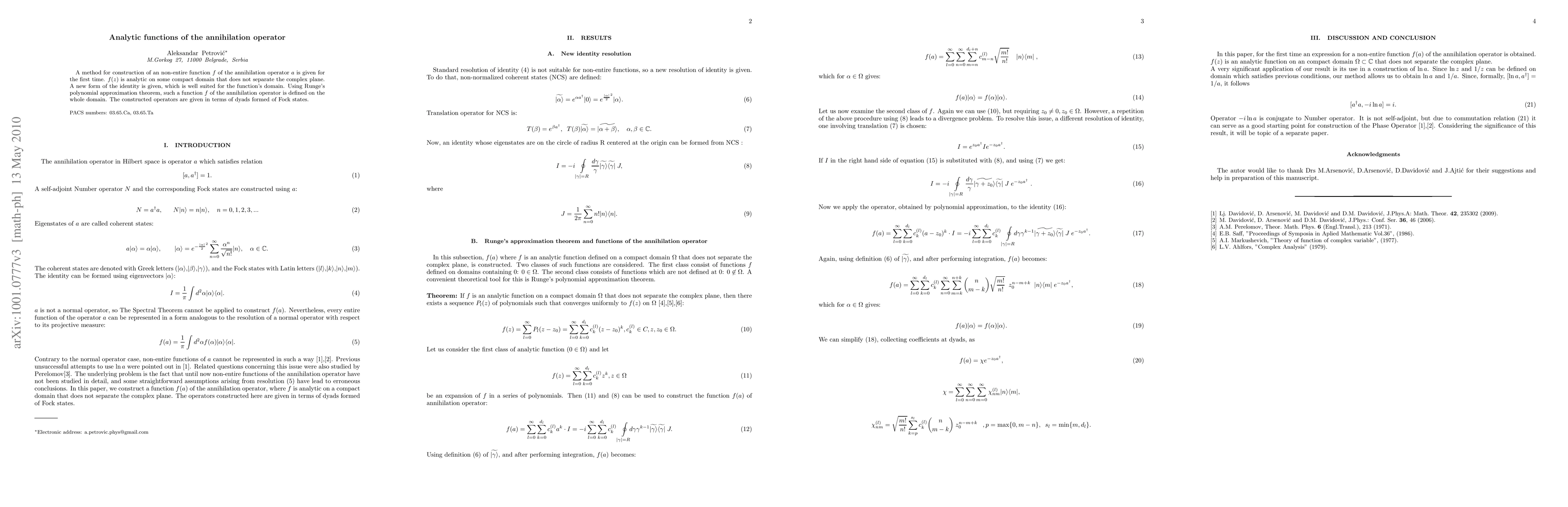 A method for construction of analytic function f of the annihilation operator is given for the first time. f(z) is analytic on some compact domain that does not separate the complex plane. A new form of the identity is given, which is well suited for domain of function. Using Runge's polynomial approximation theorem, such a function f of the annihilation operator is defined on the whole domain. The constructed operators are given in terms of dyads formed of Fock states.