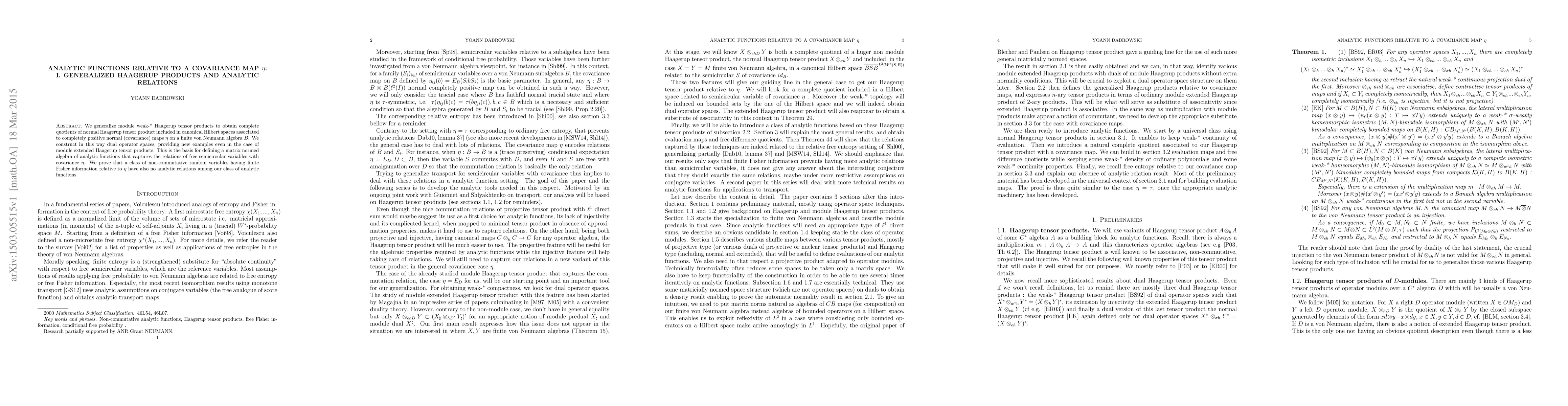 We generalize module weak-* Haagerup tensor products to obtain complete quotients of normal Haagerup tensor product included in canonical Hilbert spaces associated to completely positive normal (covariance) maps $\eta$ on a finite von Neumann algebra $B$. We construct in this way dual operator spaces, providing new examples even in the case of module extended Haagerup tensor products. This is the basis for defining a matrix normed algebra of analytic functions that captures the relations of free semicircular variables with covariance $\eta$. We prove that a class of non-commutative random variables having finite Fisher information relative to $\eta$ have also no analytic relations among our class of analytic functions.