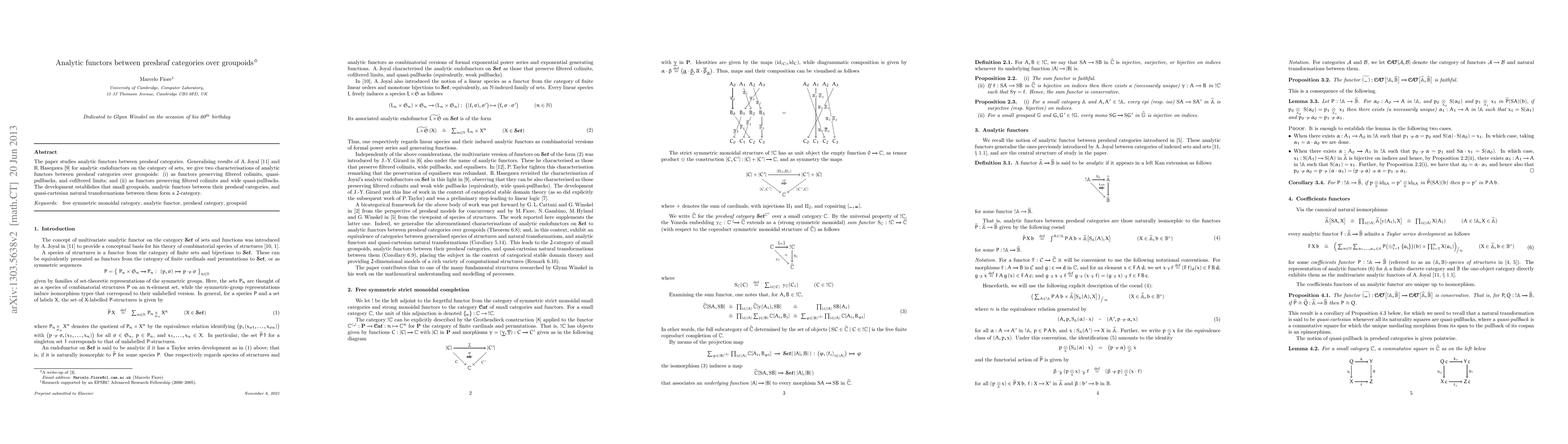 This paper characterizes analytic functors between presheaf categories over groupoids, presenting two equivalent definitions: (i) functors preserving filtered colimits, quasi-pullbacks, and cofiltered limits; and (ii) functors preserving filtered colimits and wide quasi-pullbacks. It also establishes that small groupoids, their analytic functors, and quasi-cartesian natural transformations form a 2-category.