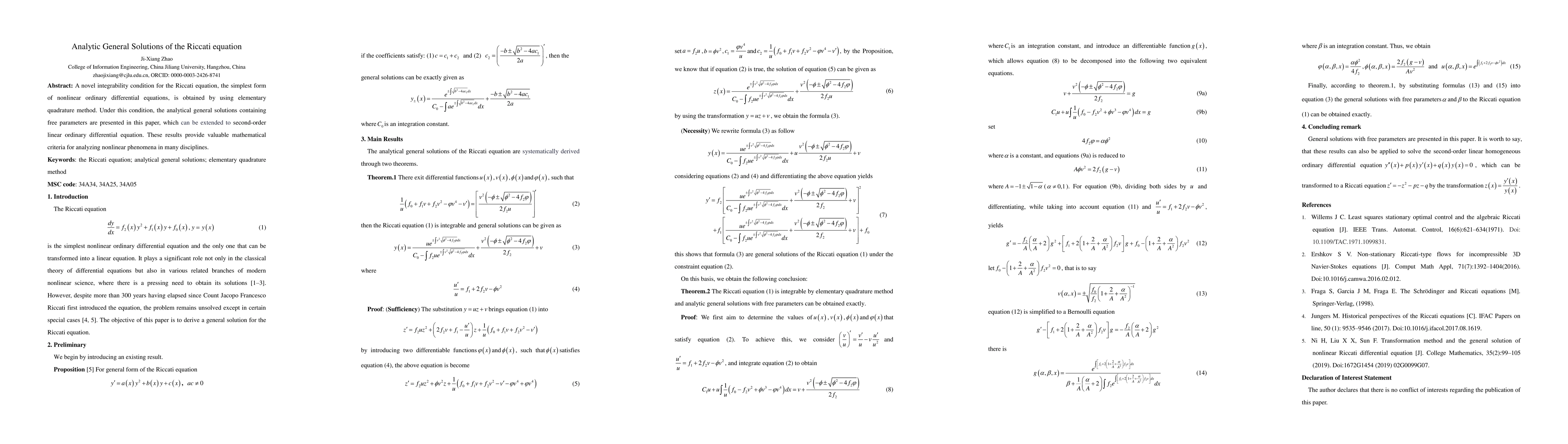 Systematic derivation of analytical general solutions for Riccati equations through two theorems and integral formulations.