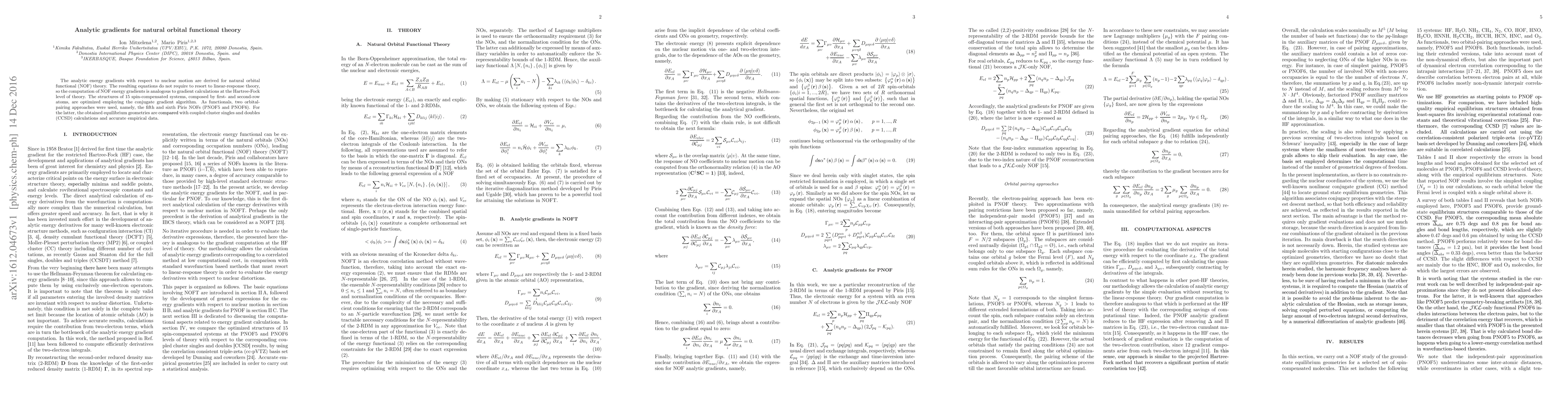 This paper derives analytic energy gradients for natural orbital functional theory (NOF) that allow for direct computation without linear-response theory, similar to Hartree-Fock gradient calculations. Structures of 15 spin-compensated systems are optimized using conjugate gradient methods, comparing results from two NOF functionals with CCSD and empirical data.