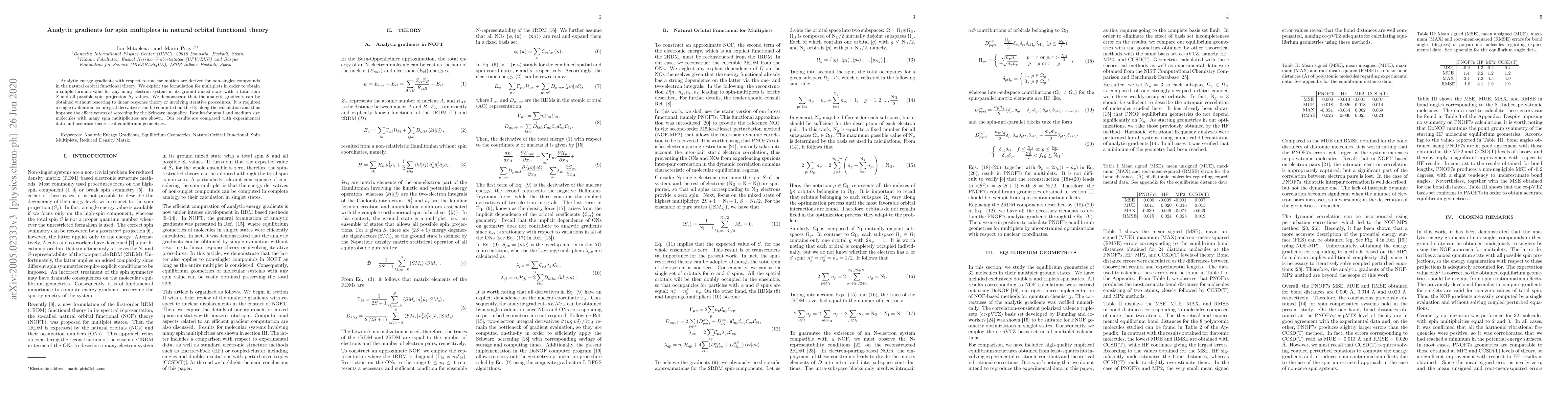Analytic energy gradients with respect to nuclear motion are derived for non-singlet compounds in the natural orbital functional theory. We exploit the formulation for multiplets in order to obtain a simple formula valid for any many-electron system in its ground mixed state with a total spin S and all possible spin projection Sz values. We demonstrate that the analytic gradients can be obtained without resorting to linear response theory or involving iterative procedures. It is required a single evaluation, so integral derivatives can be computed on-the-fly along the calculation and thus improve the effectiveness of screening by the Schwarz inequality. Results for small and medium size molecules with many spin multiplicities are shown. Our results are compared with experimental data and accurate theoretical equilibrium geometries.