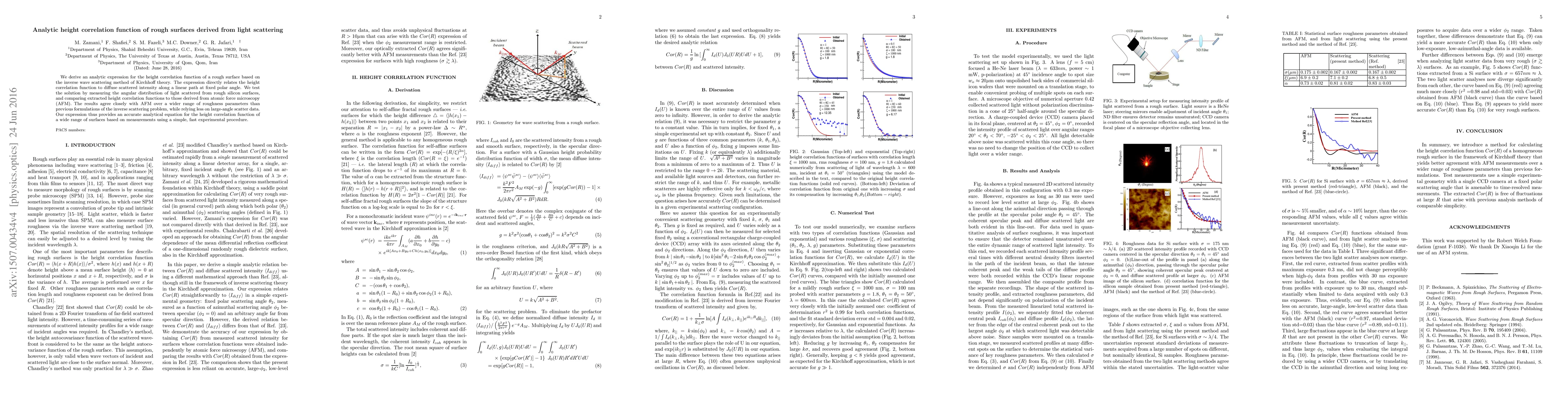 This paper derives an analytic height correlation function for rough surfaces using Kirchhoff theory and light scattering, showing close agreement with atomic force microscopy measurements. The proposed method offers a simple, fast experimental procedure for a wide range of roughness parameters.