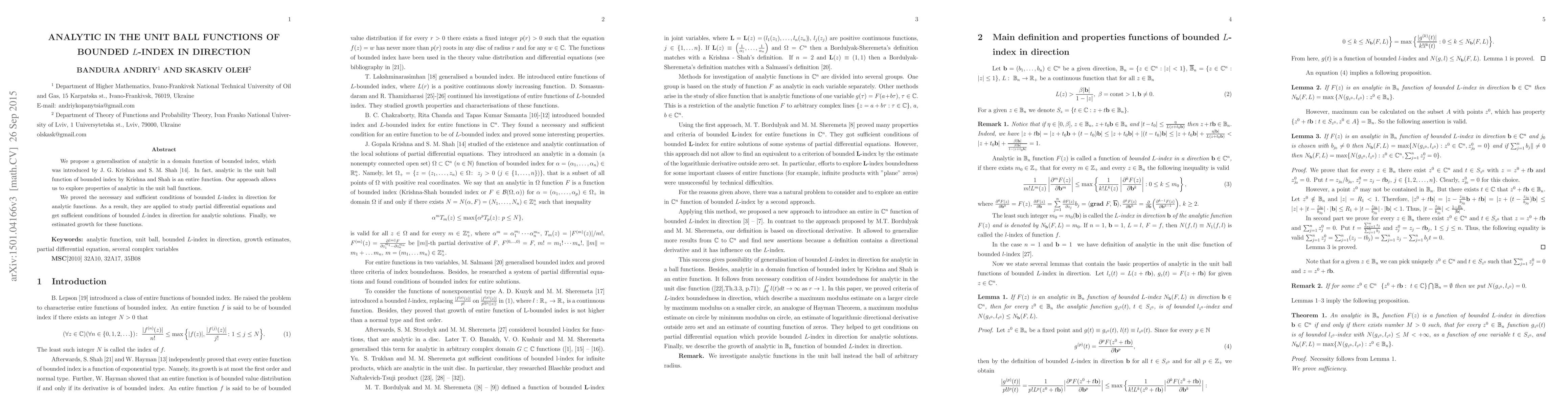 We propose a generalisation of analytic in a domain function of bounded index, which was introduced by J. G. Krishna and S. M. Shah \cite{krishna}. In fact, analytic in the unit ball function of bounded index by Krishna and Shah is an entire function. Our approach allows us to explore properties of analytic in the unit ball functions. We proved the necessary and sufficient conditions of bounded $L$-index in direction for analytic functions. As a result, they are applied to study partial differential equations and get sufficient conditions of bounded $L$-index in direction for analytic solutions. Finally, we estimated growth for these functions.