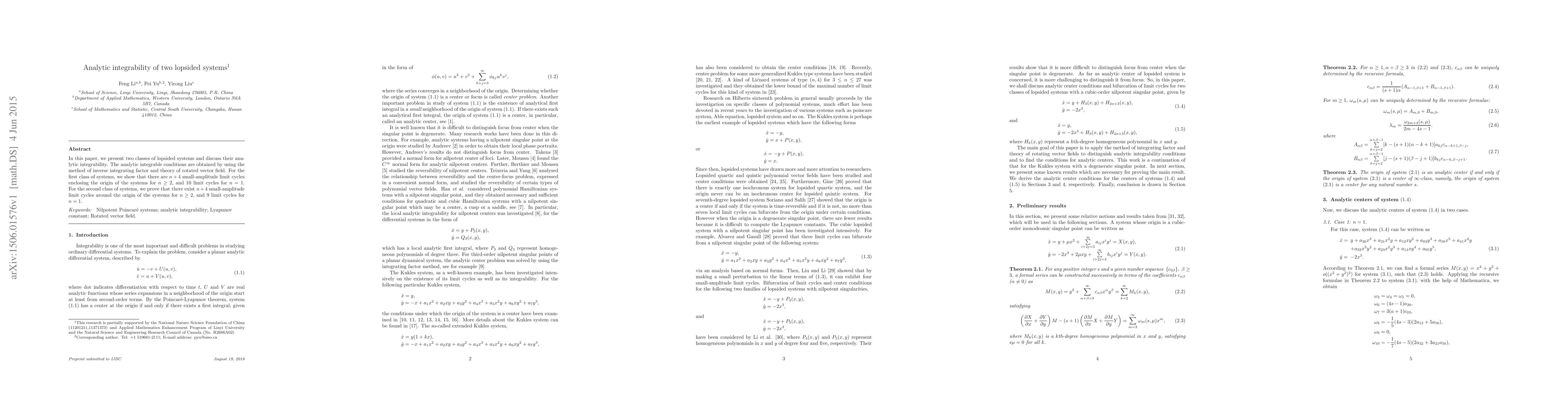 In this paper, we present two classes of lopsided systems and discuss their analytic integrability. The analytic integrable conditions are obtained by using the method of inverse integrating factor and theory of rotated vector field. For the first class of systems, we show that there are n + 4 small-amplitude limit cycles enclosing the origin of the systems for n ? 2, and 10 limit cyclesfor n = 1. For the second class of systems, we prove that there exist n+4 small-amplitude limit cycles around the origin of the systems for n ? 2, and 9 limit cycles for n = 1.
