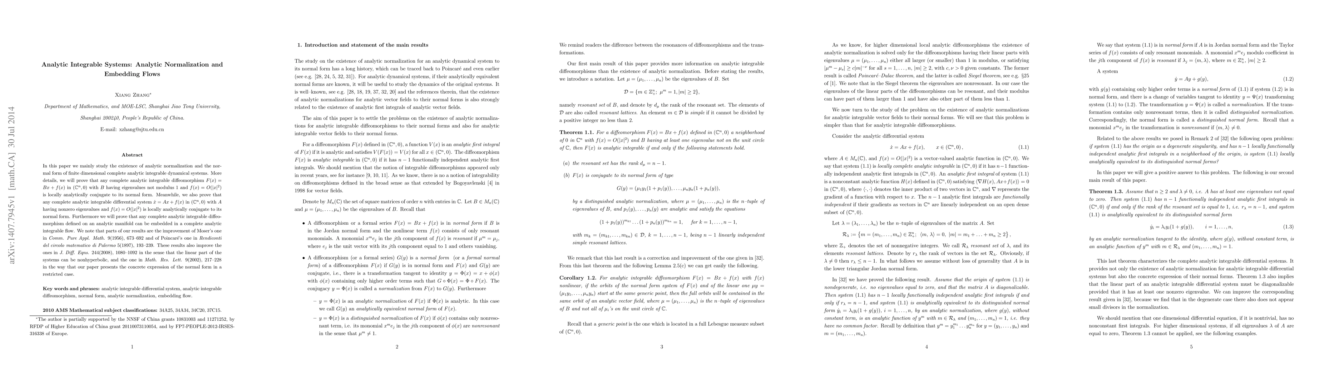 This paper investigates the existence of analytic normalization and normal forms for finite-dimensional complete analytic integrable dynamical systems. It proves local analytic conjugacy to normal forms for specific complete analytic integrable diffeomorphisms and differential systems, and demonstrates embedding of such systems in complete analytic integrable flows. The results improve upon previous works by Moser, Poincaré, and others.