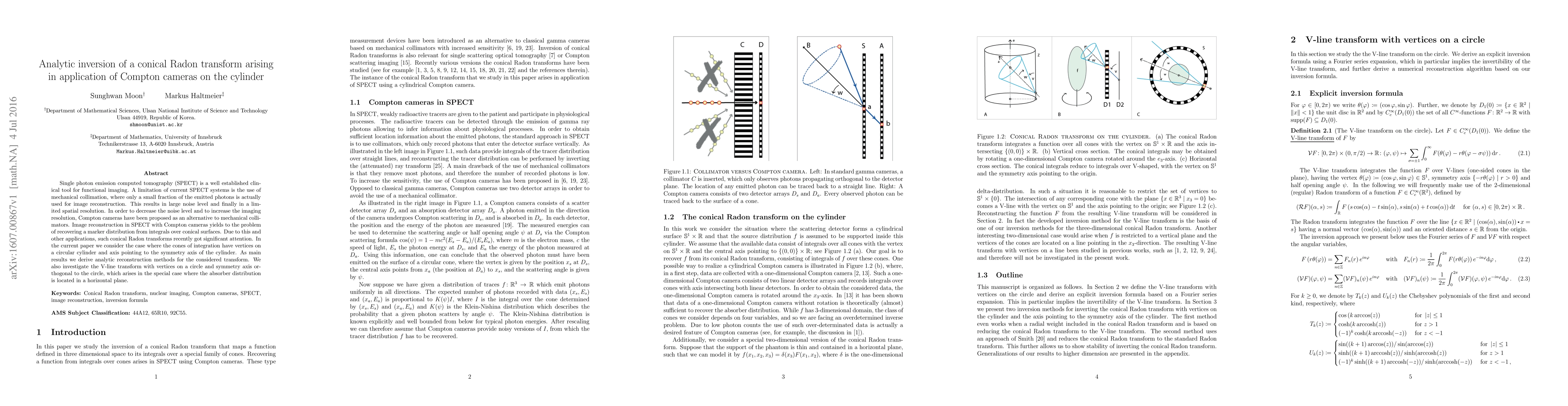 This paper develops analytic inversion methods for a conical Radon transform used in Compton cameras, which aim to improve imaging resolution and reduce noise compared to traditional SPECT systems. The study focuses on conical integrals with vertices on a circular cylinder and derives reconstruction techniques for both general and special cases involving horizontal planes.