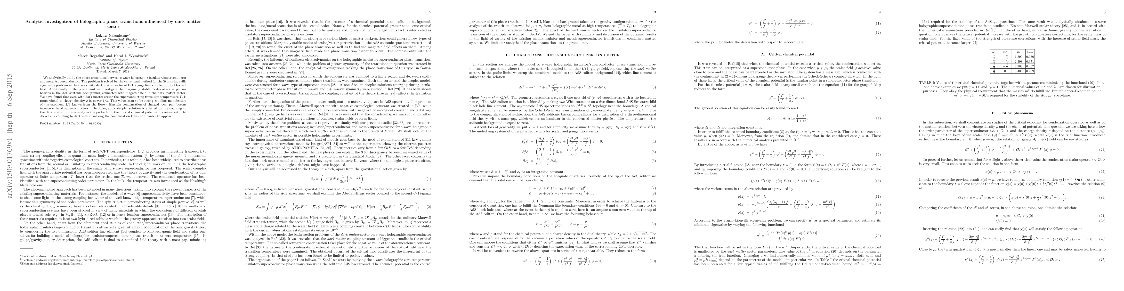 We analytically study the phase transitions between s-wave holographic insulator/superconductor and metal/superconductor. The problem is solved by the variational method for the Sturm-Liouville eigenvalue problem in the theory with dark matter sector of U(1)-gauge field coupled to the Maxwell field. Additionally in the probe limit we investigate the marginally stable modes of scalar perturbations in the AdS solitonic background, connected with magnetic field in the dark matter sector. We have found that even with dark matter sector the superconducting transition temperature $T_c$ is proportional to charge density $\rho$ in power 1/3. This value seem to be strong coupling modification of the exponent 2/3 known from the Bose - Einstein condensation of charged local pair bosons in narrow band superconductors. The holographic droplet solution is affected by the coupling to the dark matter. Interestingly in the probe limit the critical chemical potential increases with the decreasing coupling to dark matter making the condensation transition harder to appear.