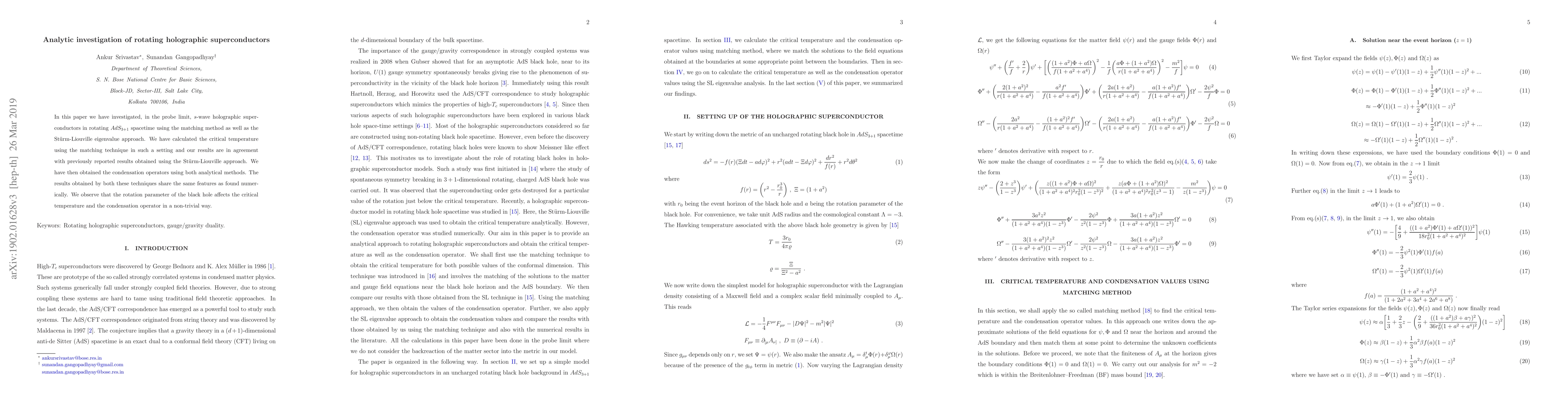 In this paper we have investigated, in the probe limit, $s$-wave holographic superconductors in rotating $AdS_{3+1}$ spacetime using the matching method as well as the St{\"u}rm-Liouville eigenvalue approach. We have calculated the critical temperature using the matching technique in such a setting and our results are in agreement with previously reported results obtained using the St{\"u}rm-Liouville approach. We have then obtained the condensation operators using both analytical methods. The results obtained by both these techniques share the same features as found numerically. We observe that the rotation parameter of the black hole affects the critical temperature and the condensation operator in a non-trivial way.