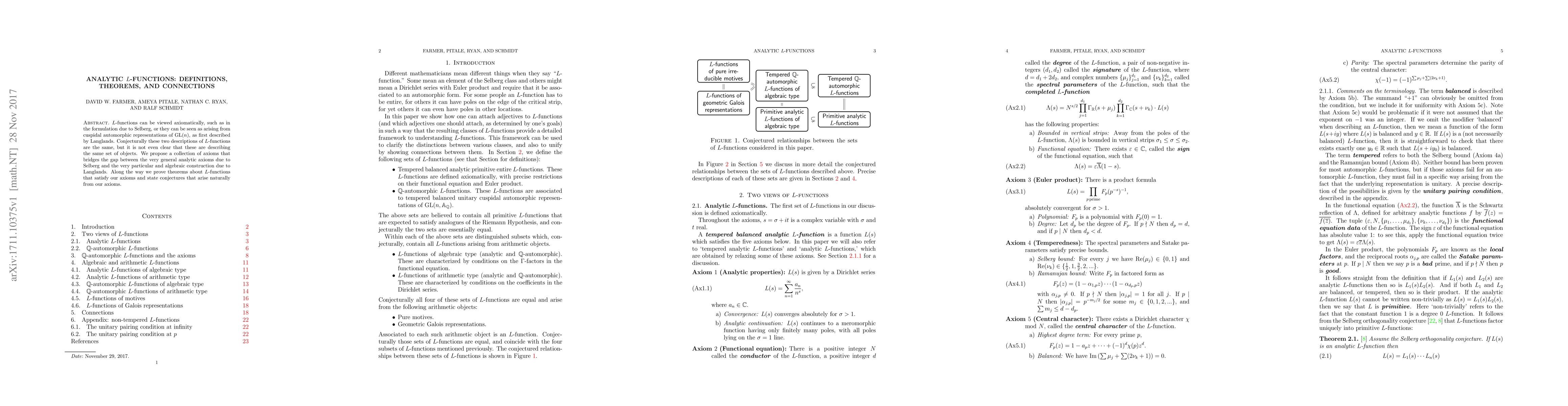$L$-functions can be viewed axiomatically, such as in the formulation due to Selberg, or they can be seen as arising from cuspidal automorphic representations of $\textrm{GL}(n)$, as first described by Langlands. Conjecturally these two descriptions of $L$-functions are the same, but it is not even clear that these are describing the same set of objects. We propose a collection of axioms that bridges the gap between the very general analytic axioms due to Selberg and the very particular and algebraic construction due to Langlands. Along the way we prove theorems about $L$-functions that satisfy our axioms and state conjectures that arise naturally from our axioms.