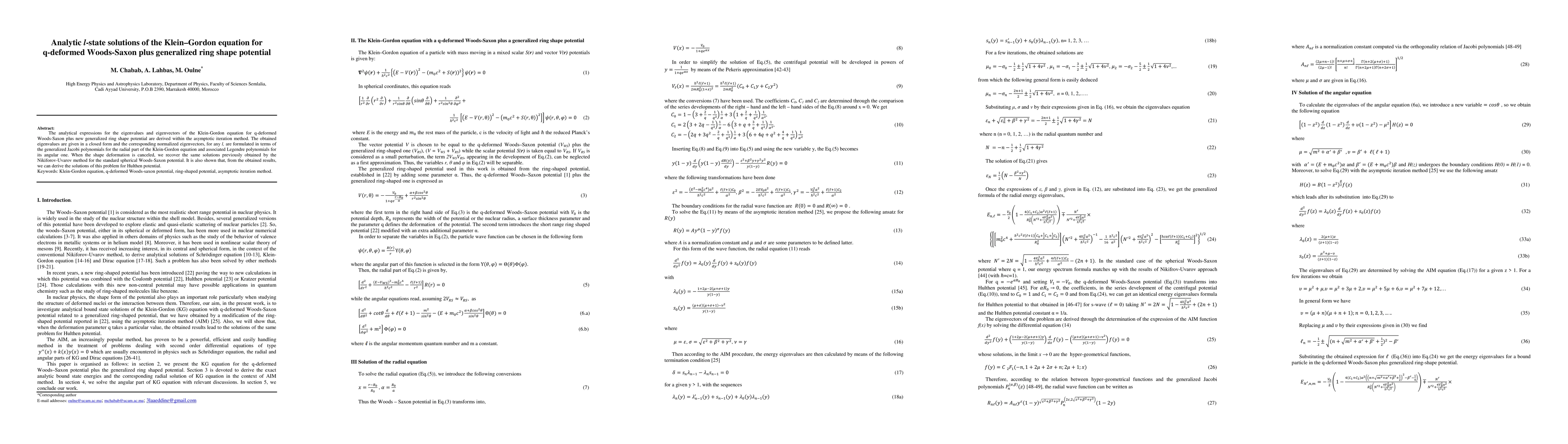 The analytical expressions for the eigenvalues and eigenvectors of the Klein-Gordon equation for q-deformed Woods-Saxon plus new generalized ring shape potential are derived within the asymptotic iteration method. The obtained eigenvalues are given in a closed form and the corresponding normalized eigenvectors, for any l, are formulated in terms of the generalized Jacobi polynomials for the radial part of the Klein-Gordon equation and associated Legendre polynomials for its angular one. When the shape deformation is canceled, we recover the same solutions previously obtained by the Nikiforov-Uvarov method for the standard spherical Woods-Saxon potential. It is also shown that, from the obtained results, we can derive the solutions of this problem for Hulthen potential.