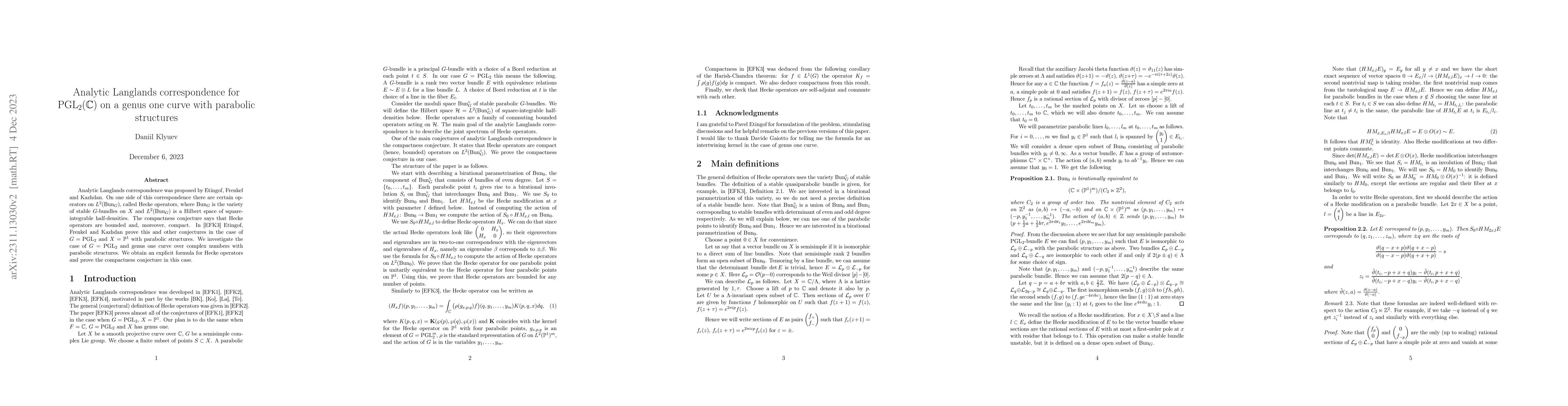 This paper investigates the analytic Langlands correspondence for $\operatorname{PGL}_2(\mathbb{C})$ on a genus one curve with parabolic structures, obtaining an explicit formula for Hecke operators and proving the compactness conjecture in this setting.