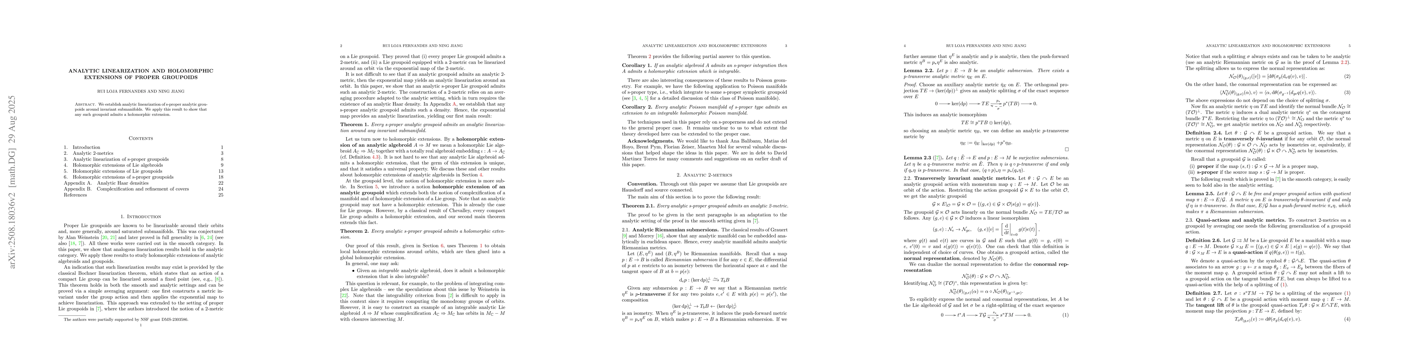 We establish analytic linearization of s-proper analytic groupoids around invariant submanifolds. We apply this result to show that any such groupoid admits a holomorphic extension.