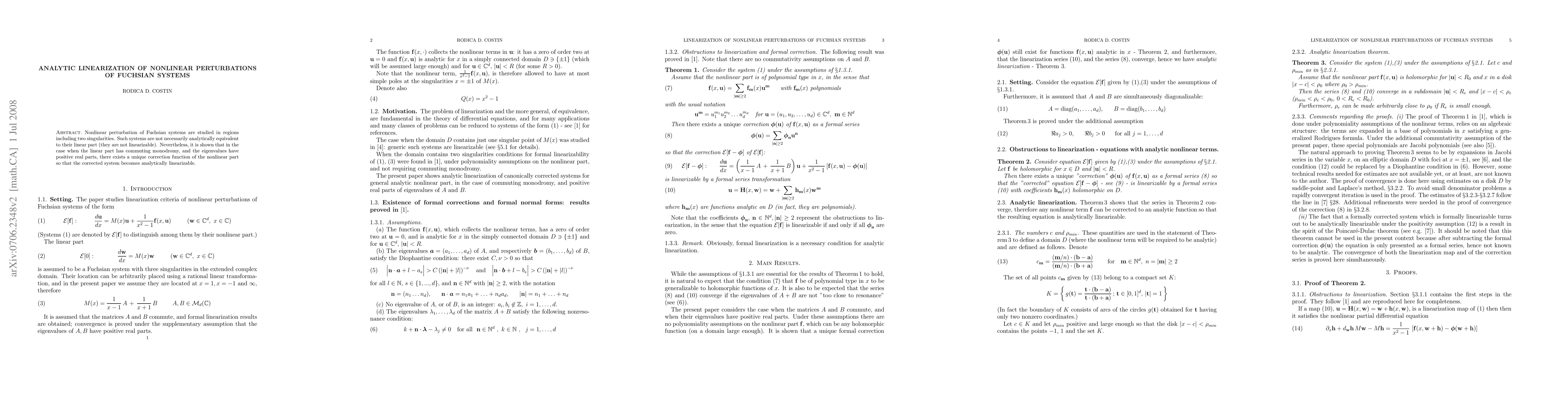 This paper investigates nonlinear perturbations of Fuchsian systems with two singularities, demonstrating that under specific conditions—commuting monodromy of the linear part and positive real parts for eigenvalues—there exists a unique correction function that analytically linearizes the perturbed system.