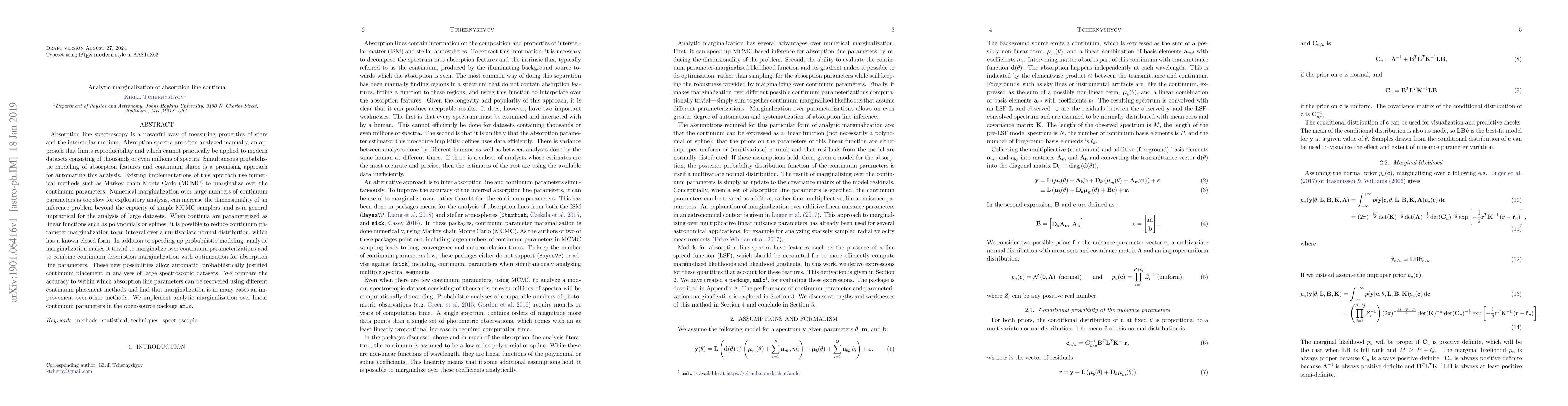 Absorption line spectroscopy is a powerful way of measuring properties of stars and the interstellar medium. Absorption spectra are often analyzed manually, an approach that limits reproducibility and which cannot practically be applied to modern datasets consisting of thousands or even millions of spectra. Simultaneous probabilistic modeling of absorption features and continuum shape is a promising approach for automating this analysis. Existing implementations of this approach use numerical methods such as Markov chain Monte Carlo (MCMC) to marginalize over the continuum parameters. Numerical marginalization over large numbers of continuum parameters is too slow to be convenient for exploratory analysis, can increase the dimensionality of an inference problem beyond the capacity of simple MCMC samplers, and is in general impractical for the analysis of large datasets. When continua are parameterized as linear functions such as polynomials or splines, it is possible to reduce continuum parameter marginalization to an integral over a multivariate normal distribution, which has a known closed form. In addition to speeding up probabilistic modeling, analytic marginalization makes it trivial to marginalize over continuum parameterizations and to combine continuum description marginalization with optimization for absorption line parameters. These new possibilities allow automatic, probabilistically justified continuum placement in analyses of large spectroscopic datasets. We compare the accuracy to within which absorption line parameters can be recovered using different continuum placement methods and find that marginalization is in many cases an improvement over other methods. We implement analytic marginalization over linear continuum parameters in the open-source package amlc.