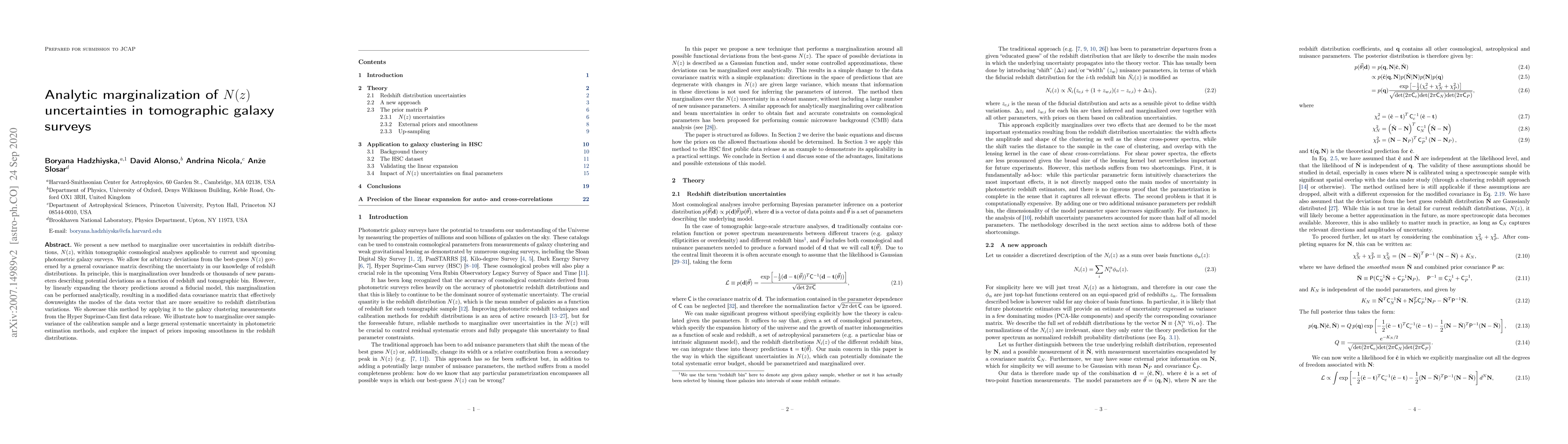 We present a new method to marginalize over uncertainties in redshift distributions, $N(z)$, within tomographic cosmological analyses applicable to current and upcoming photometric galaxy surveys. We allow for arbitrary deviations from the best-guess $N(z)$ governed by a general covariance matrix describing the uncertainty in our knowledge of redshift distributions. In principle, this is marginalization over hundreds or thousands of new parameters describing potential deviations as a function of redshift and tomographic bin. However, by linearly expanding the theory predictions around a fiducial model, this marginalization can be performed analytically, resulting in a modified data covariance matrix that effectively downweights the modes of the data vector that are more sensitive to redshift distribution variations. We showcase this method by applying it to the galaxy clustering measurements from the Hyper Suprime-Cam first data release. We illustrate how to marginalize over sample-variance of the calibration sample and a large general systematic uncertainty in photometric estimation methods, and explore the impact of priors imposing smoothness in the redshift distributions.