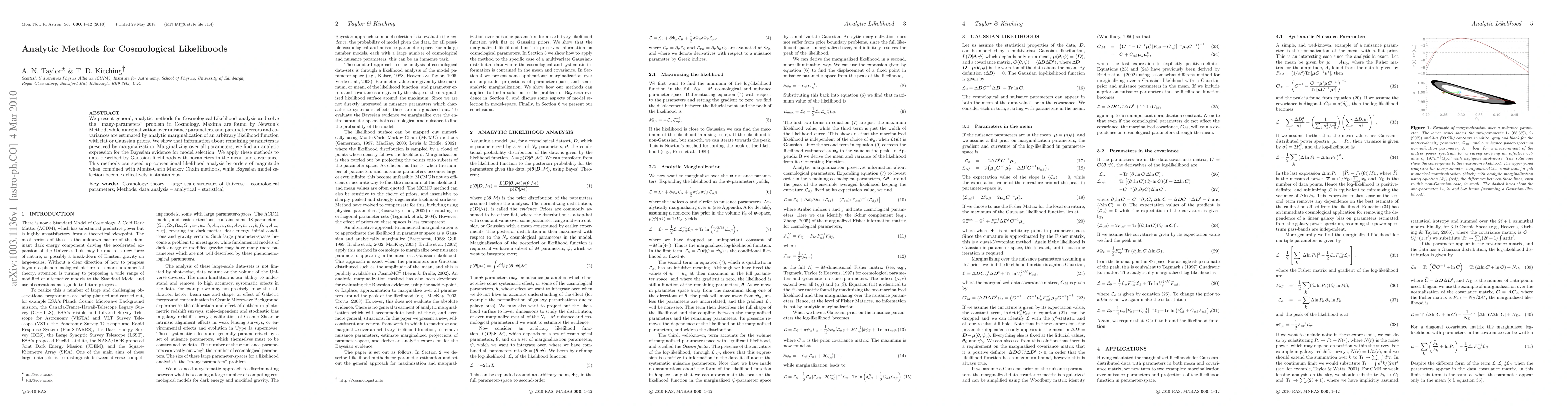 We present general, analytic methods for Cosmological likelihood analysis and solve the "many-parameters" problem in Cosmology. Maxima are found by Newton's Method, while marginalization over nuisance parameters, and parameter errors and covariances are estimated by analytic marginalization of an arbitrary likelihood function with flat or Gaussian priors. We show that information about remaining parameters is preserved by marginalization. Marginalizing over all parameters, we find an analytic expression for the Bayesian evidence for model selection. We apply these methods to data described by Gaussian likelihoods with parameters in the mean and covariance. This method can speed up conventional likelihood analysis by orders of magnitude when combined with Monte-Carlo Markov Chain methods, while Bayesian model selection becomes effectively instantaneous.