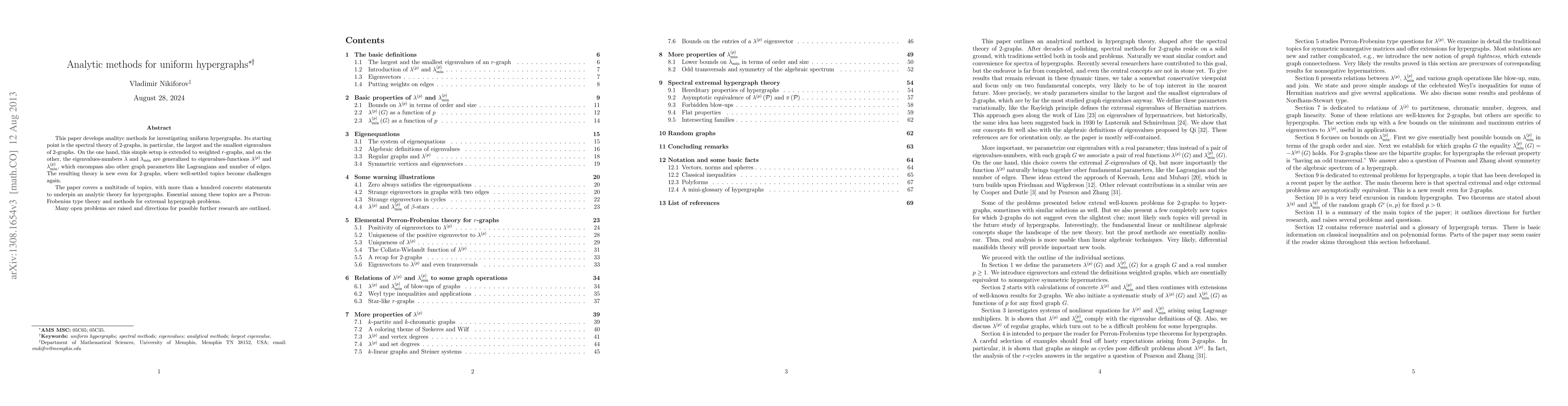 This paper develops analityc methods for investigating uniform hypergraphs. Its starting point is the spectral theory of 2-graphs, in particular, the largest and the smallest eigenvalues of 2-graphs. On the one hand, this simple setup is extended to weighted r-graphs, and on the other, the eigenvalues-numbers are generalized to eigenvalues-functions, which encompass also other graph parameters like Lagrangians and number of edges. The resulting theory is new even for 2-graphs, where well-settled topics become challenges again. The paper covers a multitude of topics, with more than a hundred concrete statements to underpin an analytic theory for hypergraphs. Essential among these topics are a Perron-Frobenius type theory and methods for extremal hypergraph problems. Many open problems are raised and directions for possible further research are outlined.