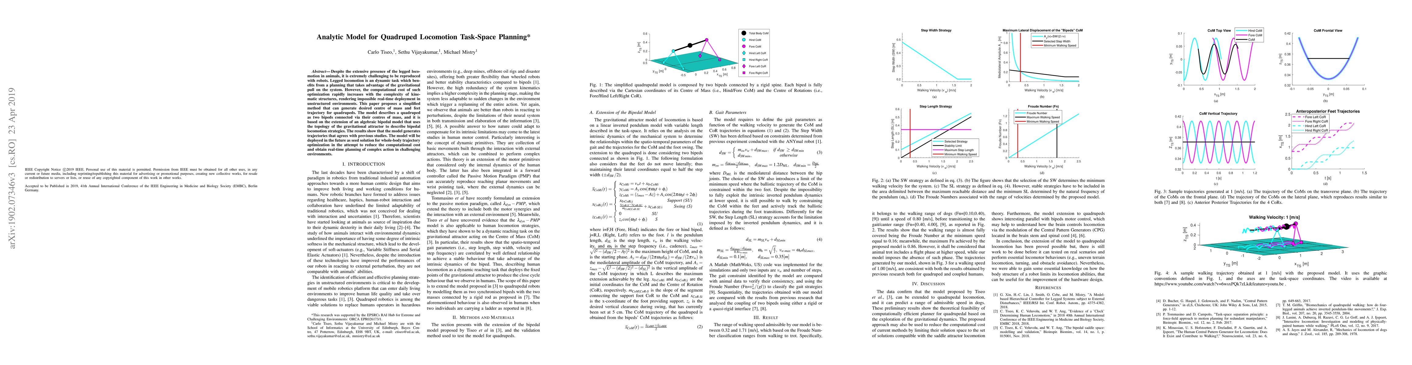 Despite the extensive presence of the legged locomotion in animals, it is extremely challenging to be reproduced with robots. Legged locomotion is an dynamic task which benefits from a planning that takes advantage of the gravitational pull on the system. However, the computational cost of such optimization rapidly increases with the complexity of kinematic structures, rendering impossible real-time deployment in unstructured environments. This paper proposes a simplified method that can generate desired centre of mass and feet trajectory for quadrupeds. The model describes a quadruped as two bipeds connected via their centres of mass, and it is based on the extension of an algebraic bipedal model that uses the topology of the gravitational attractor to describe bipedal locomotion strategies. The results show that the model generates trajectories that agrees with previous studies. The model will be deployed in the future as seed solution for whole-body trajectory optimization in the attempt to reduce the computational cost and obtain real-time planning of complex action in challenging environments.