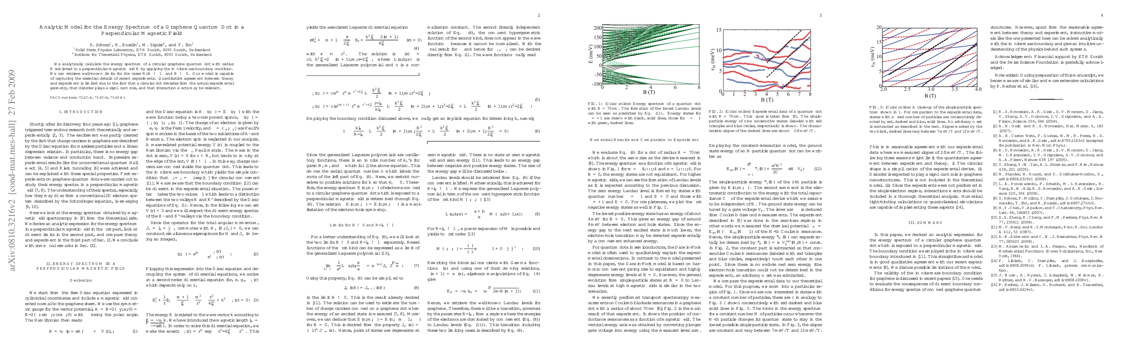 This paper presents an analytic model for the energy spectrum of a graphene quantum dot in a perpendicular magnetic field, using the infinite-mass boundary condition. The model captures essential experimental details but quantitative agreement is hindered by differences in geometry, disorder, and interaction effects.