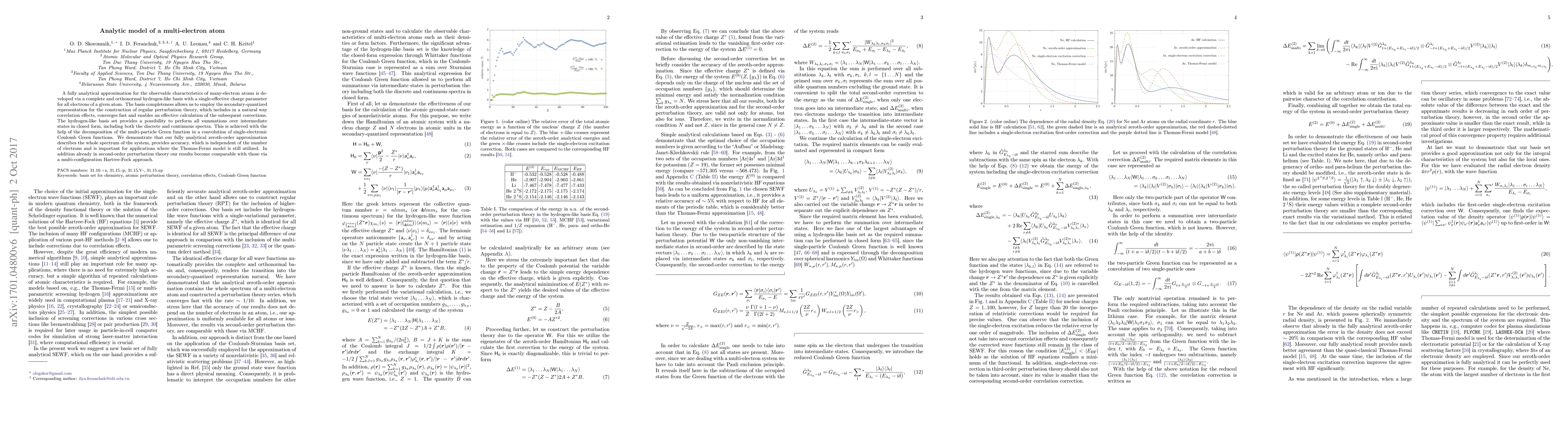 A fully analytical approximation for the observable characteristics of many-electron atoms is developed via a complete and orthonormal hydrogen-like basis with a single-effective charge parameter for all electrons of a given atom. The basis completeness allows us to employ the secondary-quantized representation for the construction of regular perturbation theory, which includes in a natural way correlation effects, converges fast and enables an effective calculation of the subsequent corrections. The hydrogen-like basis set provides a possibility to perform all summations over intermediate states in closed form, including both the discrete and continuous spectra. This is achieved with the help of the decomposition of the multi-particle Green function in a convolution of single-electronic Coulomb Green functions. We demonstrate that our fully analytical zeroth-order approximation describes the whole spectrum of the system, provides accuracy, which is independent of the number of electrons and is important for applications where the Thomas-Fermi model is still utilized. In addition already in second-order perturbation theory our results become comparable with those via a multi-configuration Hartree-Fock approach.