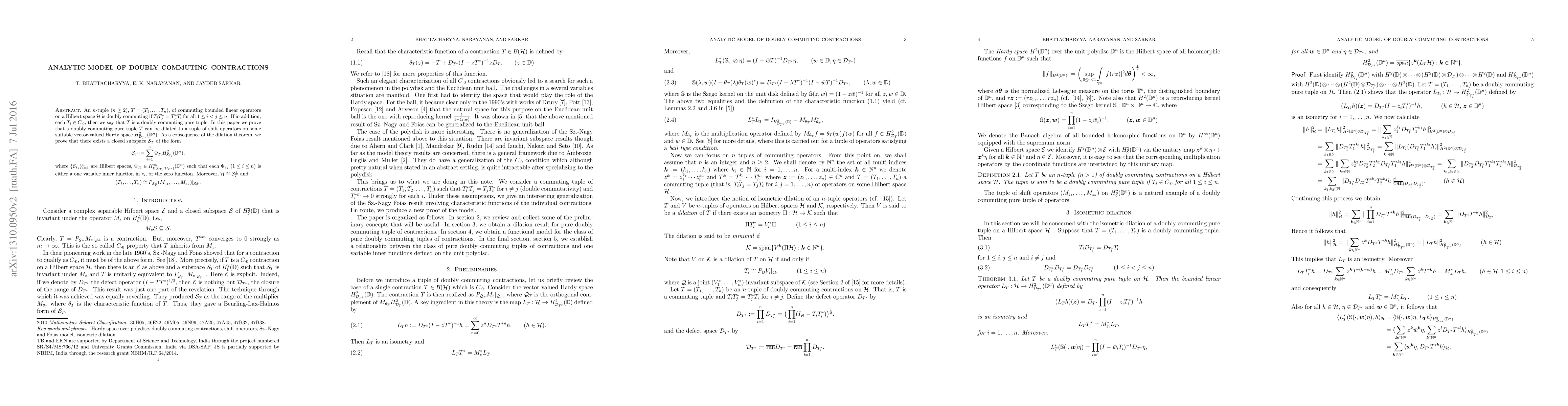 An n-tuple (n \geq 2), T = (T_1, \ldots, T_n), of commuting bounded linear operators on a Hilbert space \mathcal{H} is doubly commuting if T_i T_j^* = T_j^* T_i for all $1 \leq i < j \leq n$. If in addition, each T_i \in C_{\cdot 0}, then we say that T is a doubly commuting pure tuple. In this paper we prove that a doubly commuting pure tuple $T$ can be dilated to a tuple of shift operators on some suitable vector-valued Hardy space H^2_{\mathcal{D}_{T^*}}(\mathbb{D}^n). As a consequence of the dilation theorem, we prove that there exists a closed subspace \mathcal{S}_T of the form \[\mathcal{H}_{T} := \sum_{i=1}^n \Phi_{T_i} H^2_{\mathcal{E}_{T_i}}(\mathbb{D}^n),\] where \{\mathcal{E}_{T_i}\}_{i=1}^n are Hilbert spaces, \Phi_{T_i} \in H^\infty_{\mathcal{B}(\mathcal{E}_{T_i}, \mathcal{D}_{T^*})}(\mathbb{D}^n) such that each \Phi_{T_i} (1 \leq i \leq n) is either a one variable inner function in z_i, or the zero function. Moreover, \mathcal{H} \cong \mathcal{S}_T^\perp and \[(T_1, \ldots, T_n) \cong P_{\mathcal{S}_T^\perp} (M_{z_1}, \ldots, M_{z_n})|_{\mathcal{S}_T^\perp}.\]