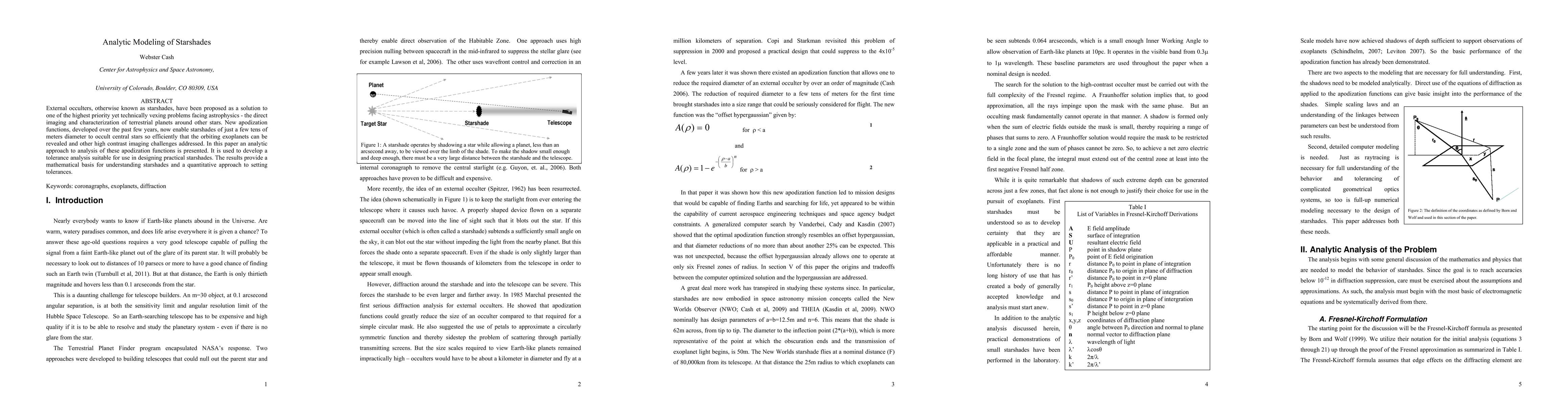 External occulters, otherwise known as starshades, have been proposed as a solution to one of the highest priority yet technically vexing problems facing astrophysics - the direct imaging and characterization of terrestrial planets around other stars. New apodization functions, developed over the past few years, now enable starshades of just a few tens of meters diameter to occult central stars so efficiently that the orbiting exoplanets can be revealed and other high contrast imaging challenges addressed. In this paper an analytic approach to analysis of these apodization functions is presented. It is used to develop a tolerance analysis suitable for use in designing practical starshades. The results provide a mathematical basis for understanding starshades and a quantitative approach to setting tolerances.