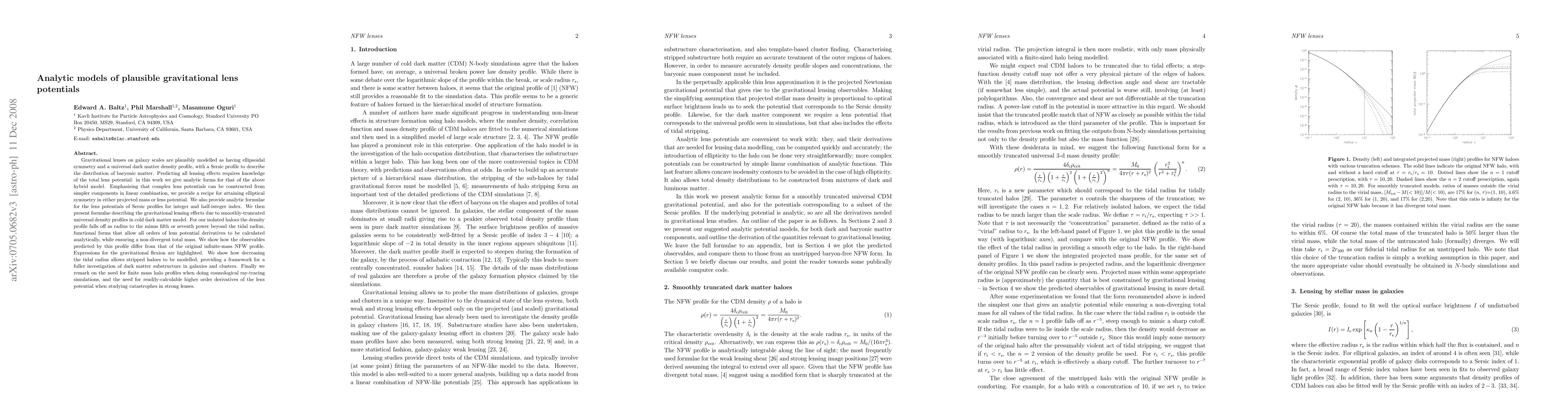 Gravitational lenses on galaxy scales are plausibly modelled as having ellipsoidal symmetry and a universal dark matter density profile, with a Sersic profile to describe the distribution of baryonic matter. Predicting all lensing effects requires knowledge of the total lens potential: in this work we give analytic forms for that of the above hybrid model. Emphasising that complex lens potentials can be constructed from simpler components in linear combination, we provide a recipe for attaining elliptical symmetry in either projected mass or lens potential. We also provide analytic formulae for the lens potentials of Sersic profiles for integer and half-integer index. We then present formulae describing the gravitational lensing effects due to smoothly-truncated universal density profiles in cold dark matter model. For our isolated haloes the density profile falls off as radius to the minus fifth or seventh power beyond the tidal radius, functional forms that allow all orders of lens potential derivatives to be calculated analytically, while ensuring a non-divergent total mass. We show how the observables predicted by this profile differ from that of the original infinite-mass NFW profile. Expressions for the gravitational flexion are highlighted. We show how decreasing the tidal radius allows stripped haloes to be modelled, providing a framework for a fuller investigation of dark matter substructure in galaxies and clusters. Finally we remark on the need for finite mass halo profiles when doing cosmological ray-tracing simulations, and the need for readily-calculable higher order derivatives of the lens potential when studying catastrophes in strong lenses.
