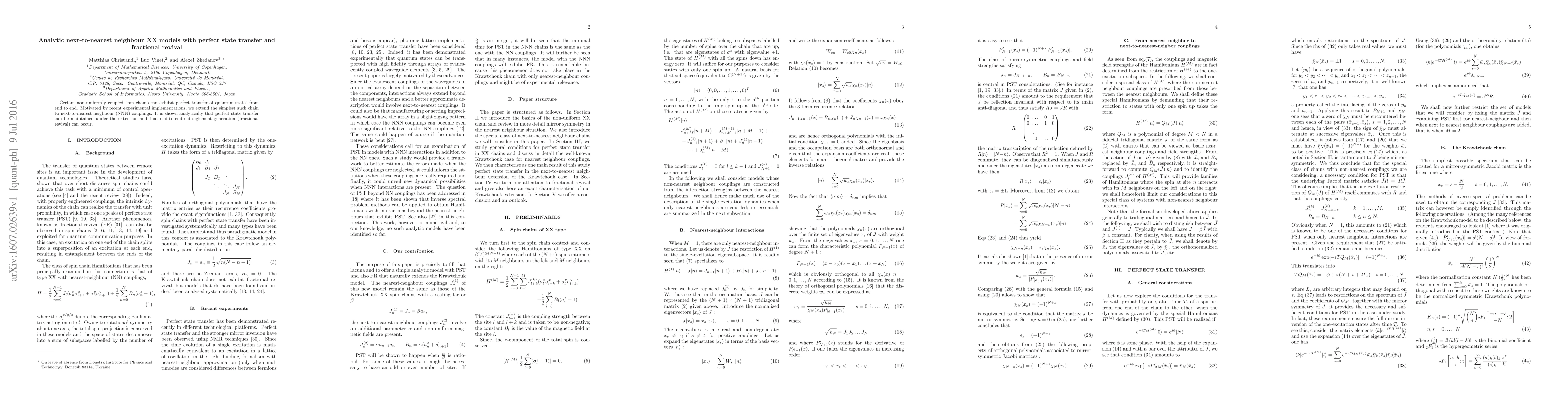 This paper analytically investigates next-to-nearest neighbour XX spin chains, demonstrating that perfect state transfer can be preserved and end-to-end entanglement generation, or fractional revival, can occur in these extended models.
