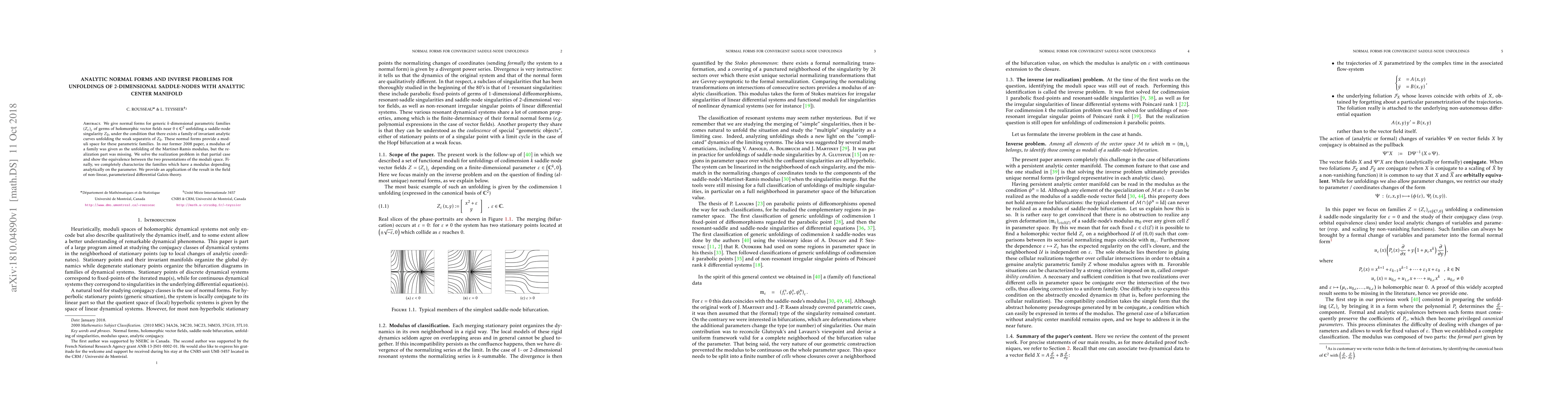 This paper provides normal forms for unfoldings of 2-dimensional saddle-node singularities in holomorphic vector fields, focusing on families with invariant analytic curves. It resolves the realization problem for moduli spaces and characterizes families with analytically dependent moduli, with applications in non-linear differential Galois theory.
