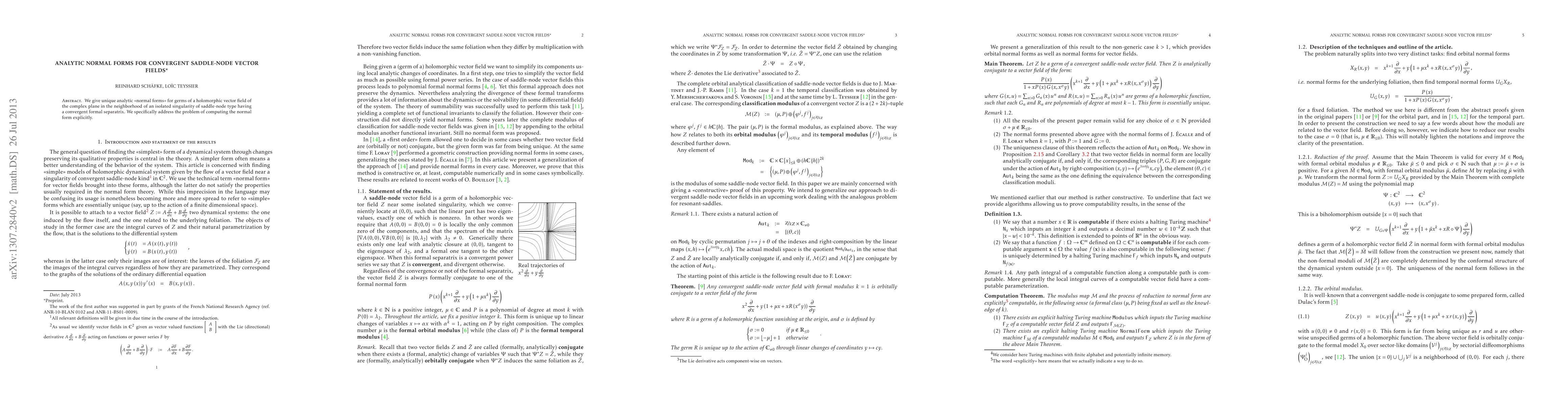 This paper provides unique analytic normal forms for holomorphic vector fields near saddle-node singularities with a convergent formal separatrix. It focuses on explicitly computing these normal forms.