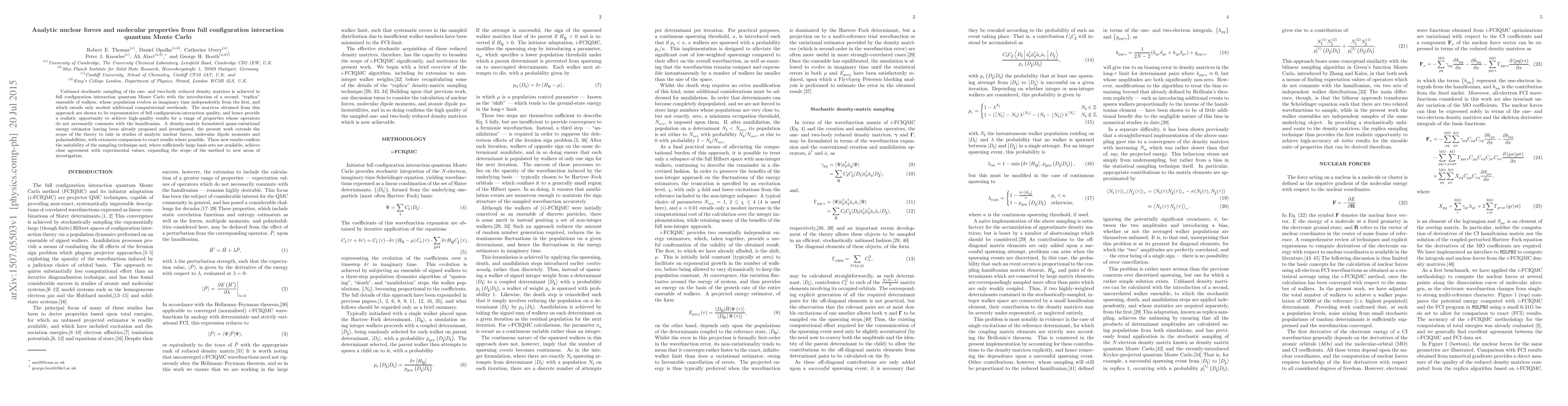 This paper introduces a novel full configuration interaction quantum Monte Carlo method using a replica ensemble to unbiasedly sample density matrices, achieving high-quality results for non-commuting operators. It extends the method to study analytic nuclear forces, molecular dipole moments, and polarisabilities, showing close agreement with experimental values and exact results.