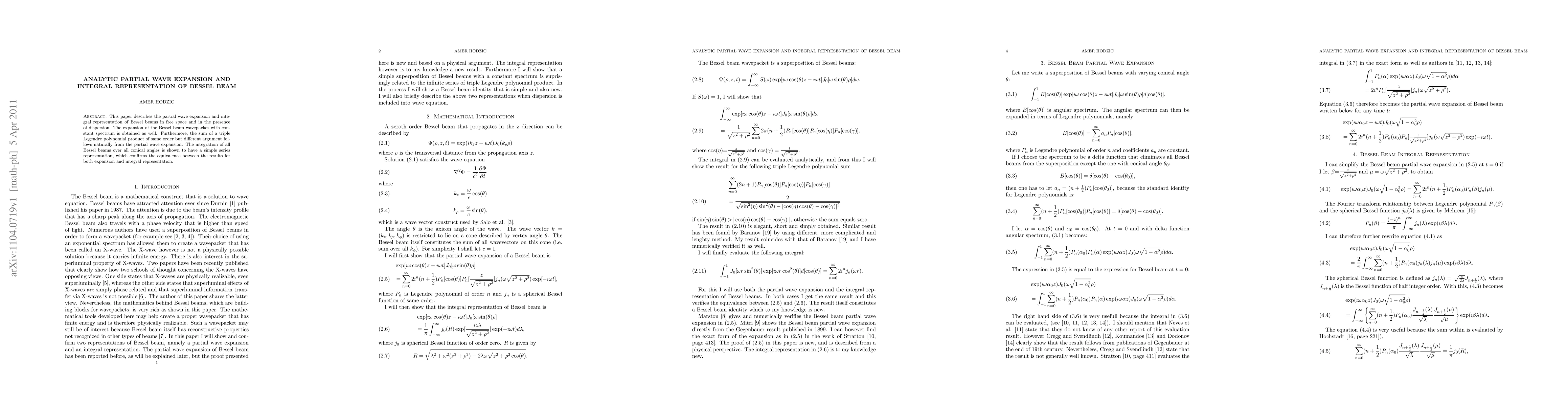 This paper describes the partial wave expansion and integral representation of Bessel beams in free space and in the presence of dispersion. The expansion of the Bessel beam wavepacket with constant spectrum is obtained as well. Furthermore, the sum of a triple Legendre polynomial product of same order but different argument follows naturally from the partial wave expansion. The integration of all Bessel beams over all conical angles is shown to have a simple series representation, which confirms the equivalence between the results for both expansion and integral representation.