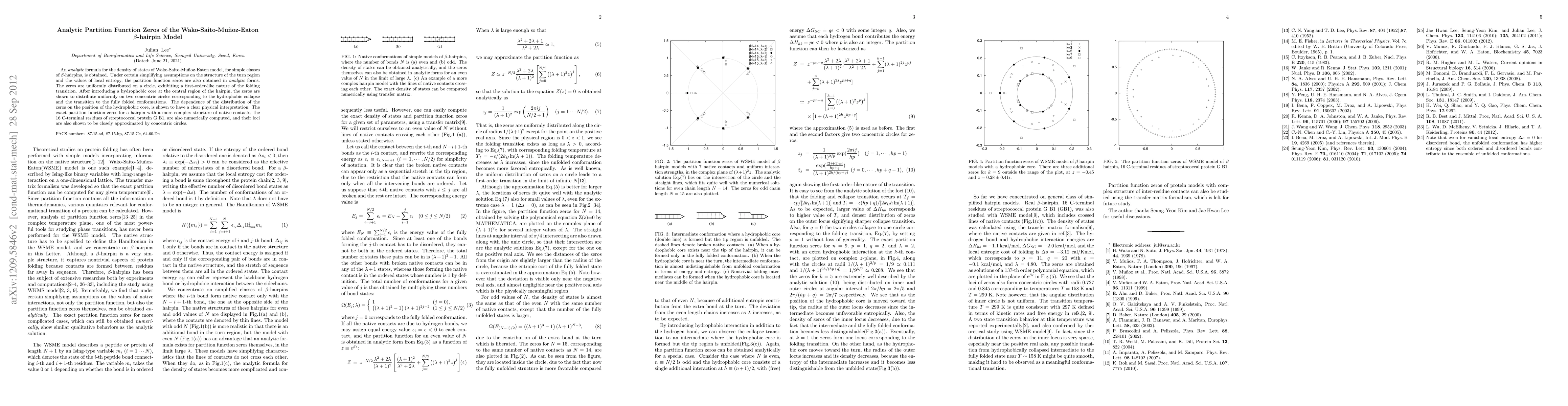 An analytic formula for the density of states of Wako-Saito-Munoz-Eaton model, for a simple class of beta-hairpins, is obtained. Under certain simplifying assumptions on the structure of the native contacts and the values of local entropy, the partition function zeros are also obtained in analytic forms. The zeros are uniformly distributed on a circle, exhibiting a first-order-like nature of the folding transition. After introducing hydrophobic core at the central region of the hairpin, the zeros are shown to distribute uniformly on two concentric circles corresponding to the hydrophobic collapse and the transition to the fully folded conformations. The dependence of the distribution of the zeros on the position of the hydrophobic core, is shown to have a clear physical interpretation. The exact partition function zeros for a hairpin with a more complex structure of native contacts, the 16 C-terminal residues of streptococcal protein G B1, are also numerically computed, and their loci are also shown to be closely approximated by concentric circles.