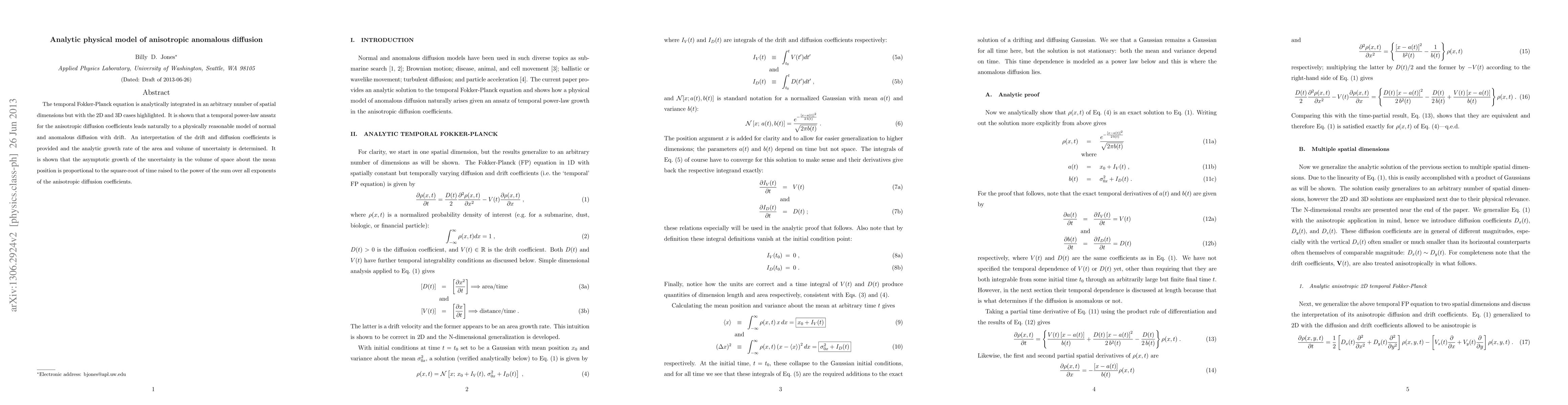 Researchers develop an analytic physical model of anisotropic anomalous diffusion, showing that a temporal power-law ansatz naturally leads to physically reasonable models of normal and anomalous diffusion with drift. The uncertainty in volume space grows proportionally to the square-root of time raised to the power of the sum of exponents of the anisotropic diffusion coefficients.
