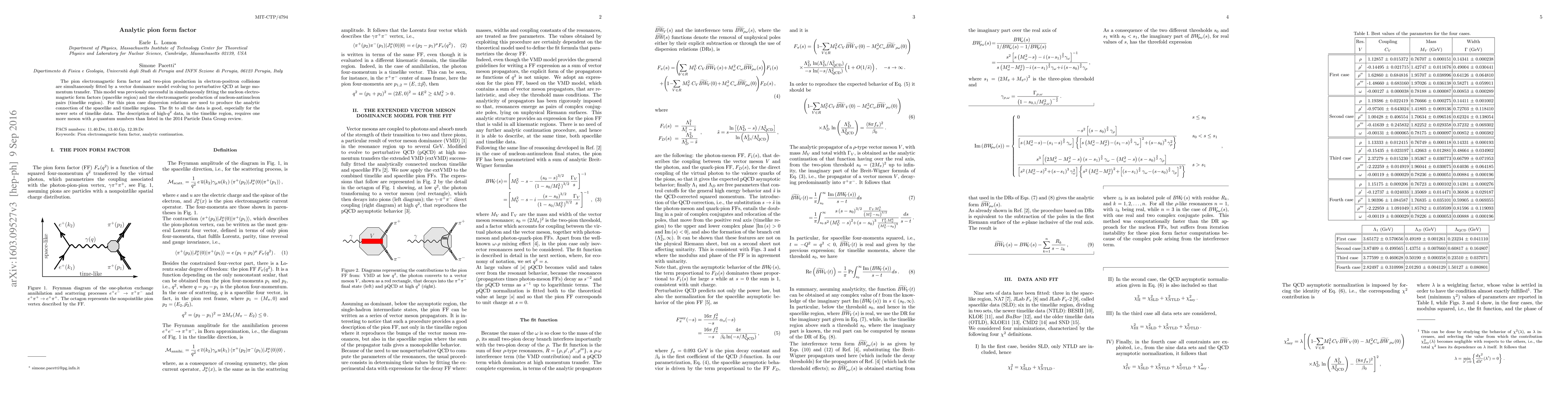 This paper fits the pion electromagnetic form factor and two-pion production in electron-positron collisions using a vector dominance model transitioning to perturbative QCD, achieving a good fit to data. The model also requires an additional meson with $\rho$ quantum numbers to accurately describe high-momentum transfer data.