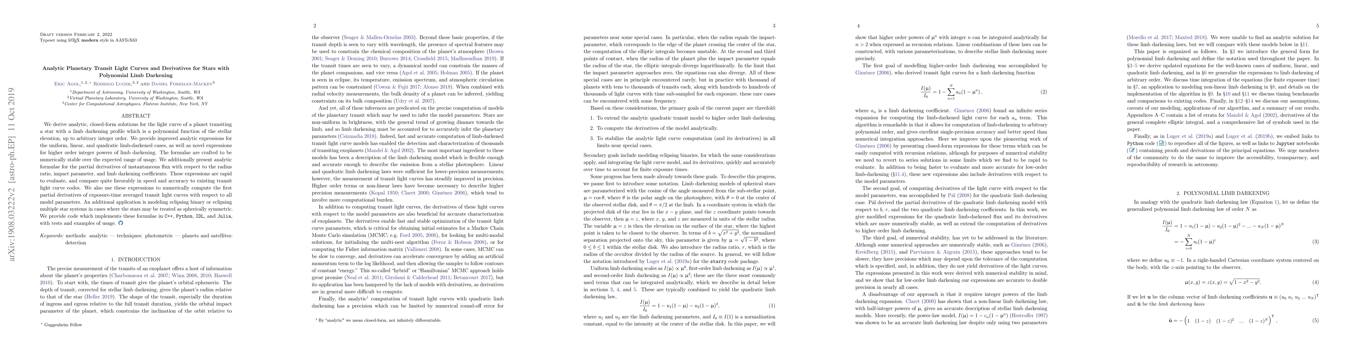 This paper presents analytic, closed-form solutions for planetary transit light curves considering polynomial limb darkening profiles, providing improved and novel expressions for various orders. It also offers rapid evaluation formulae for partial derivatives of instantaneous flux and includes code implementations in multiple languages.