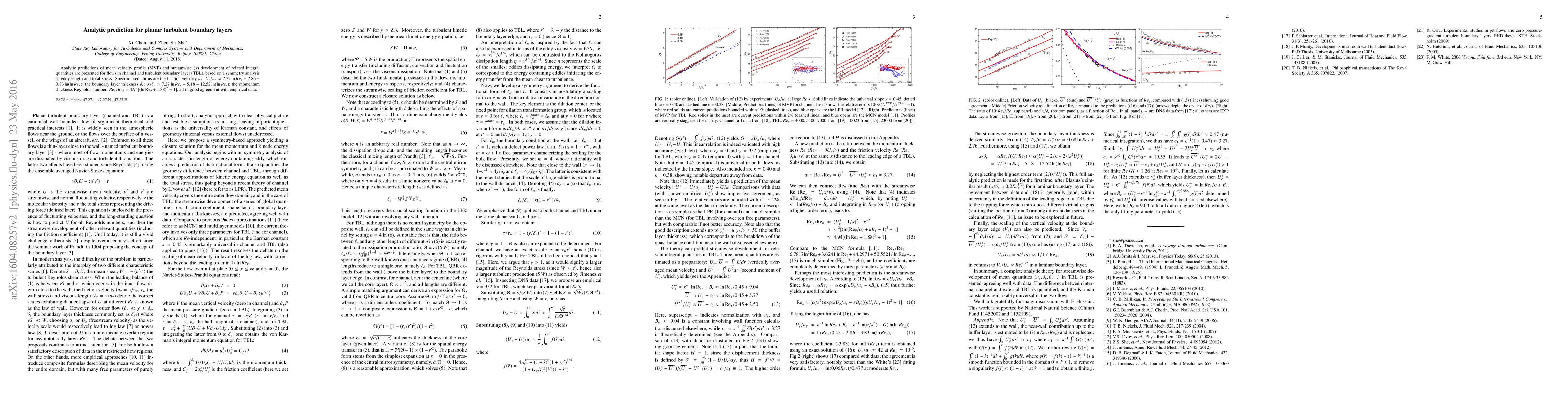 This paper presents analytic predictions for mean velocity profiles and integral quantities in planar turbulent boundary layers, derived from symmetry analysis of eddy length and total stress. The results include expressions for friction velocity, boundary layer thickness, and momentum thickness Reynolds number, which align well with empirical data.