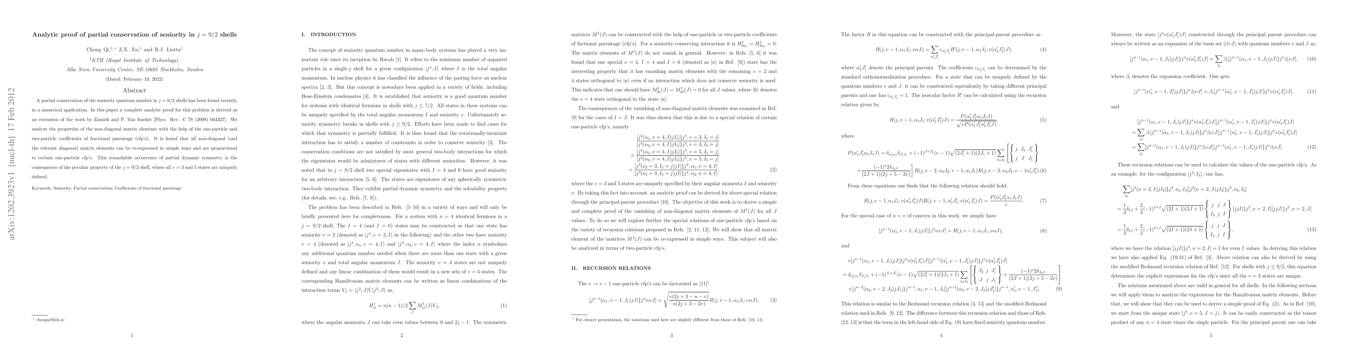 This paper provides an analytic proof for the partial conservation of seniority in $j=9/2$ nuclear shells, extending previous numerical findings. It demonstrates that non-diagonal matrix elements can be re-expressed in terms of one-particle coefficients of fractional parentage, revealing a unique dynamic symmetry in the $j=9/2$ shell.