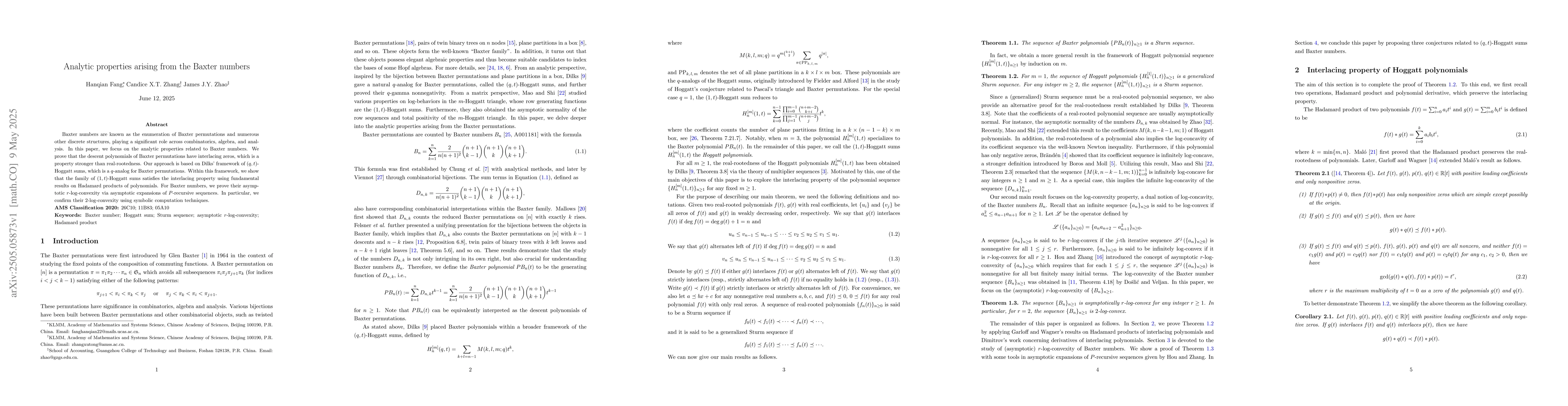 The work extends existing knowledge by proving stronger real-rootedness properties, specifically interlacing zeros, and establishing asymptotic log-convexity for Baxter numbers, utilizing advanced techniques from $q$-analog theory and symbolic computation.