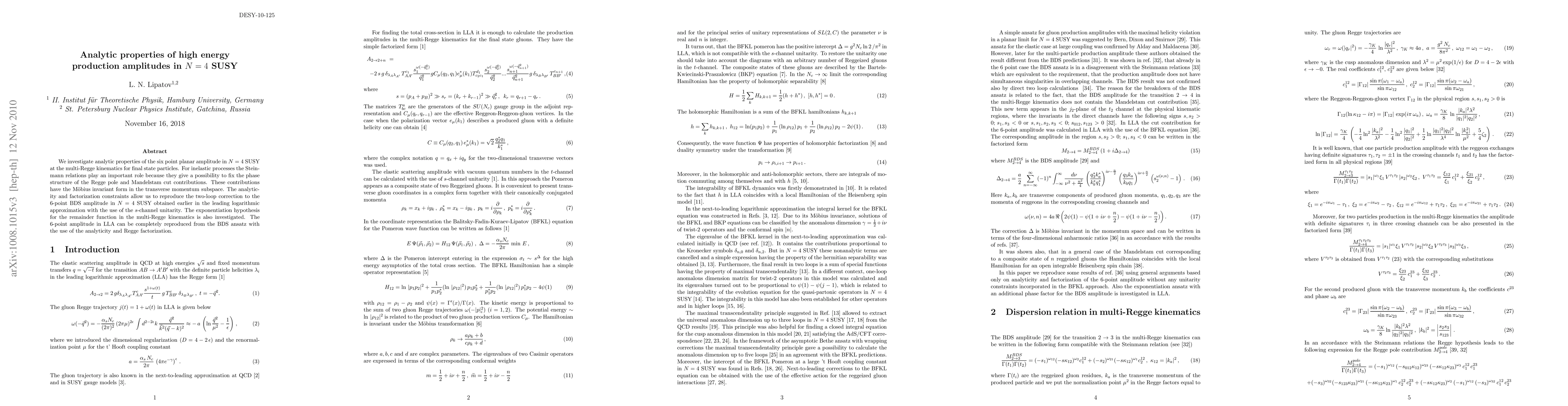 We investigate analytic properties of the six point planar amplitude in N=4 SUSY at the multi-Regge kinematics for final state particles. For inelastic processes the Steinmann relations play an important role because they give a possibility to fix the phase structure of the Regge pole and Mandelstam cut contributions. These contributions have the Moebius invariant form in the transverse momentum subspace. The analyticity and factorization constraints allow us to reproduce the two-loop correction to the 6-point BDS amplitude in N=4 SUSY obtained earlier in the leading logarithmic approximation with the use of the s-channel unitarity. The exponentiation hypothesis for the remainder function in the multi-Regge kinematics is also investigated. The 6-point amplitude in LLA can be completely reproduced from the BDS ansatz with the use of the analyticity and Regge factorization.